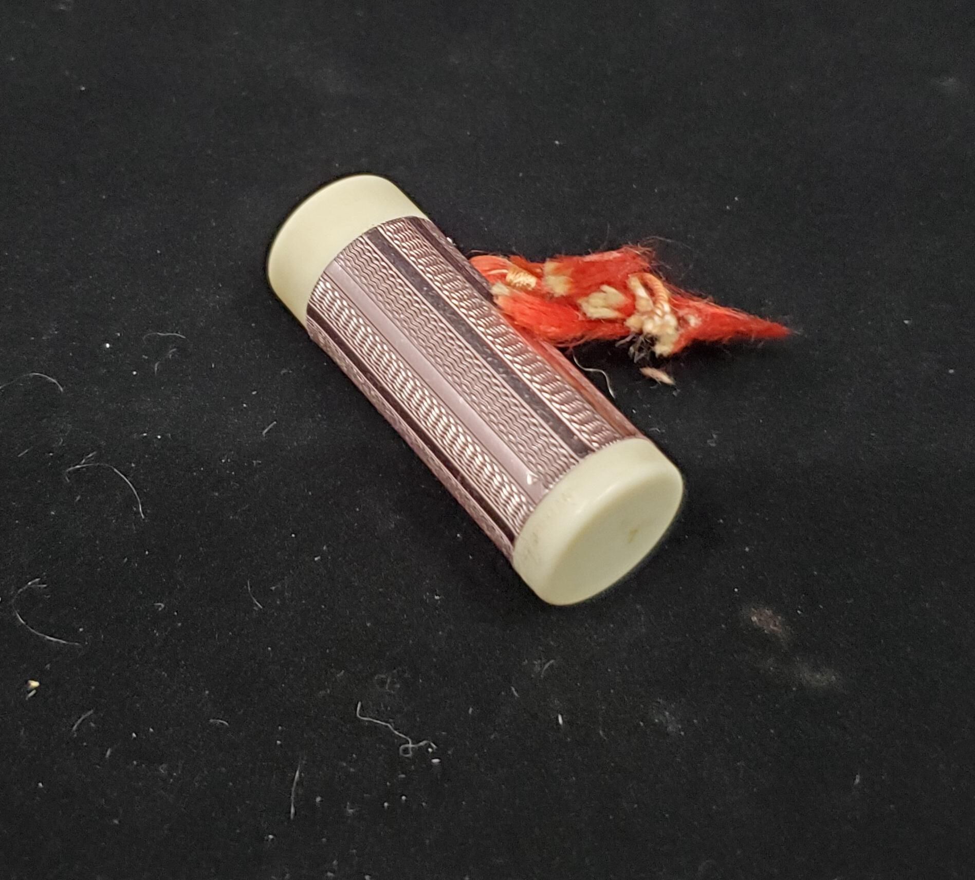 White plastic and mauvey pink metal sewing kit. with red tassel.Inside dark purple mottled bobbin for 2 coloured threads. Inside hollow for pins, needles, etc. with clear plastic top.Gold coloured metal thimble. Thimble is thin gold coloured metal with raised band at rim. Narrow vetically lined band above then a wide plain band with a vertically lined narrow band at top. Narrow plain band, several rows of knurling then another narrow plain band and a few rows of knurling to top. Knurling over top. No marks.