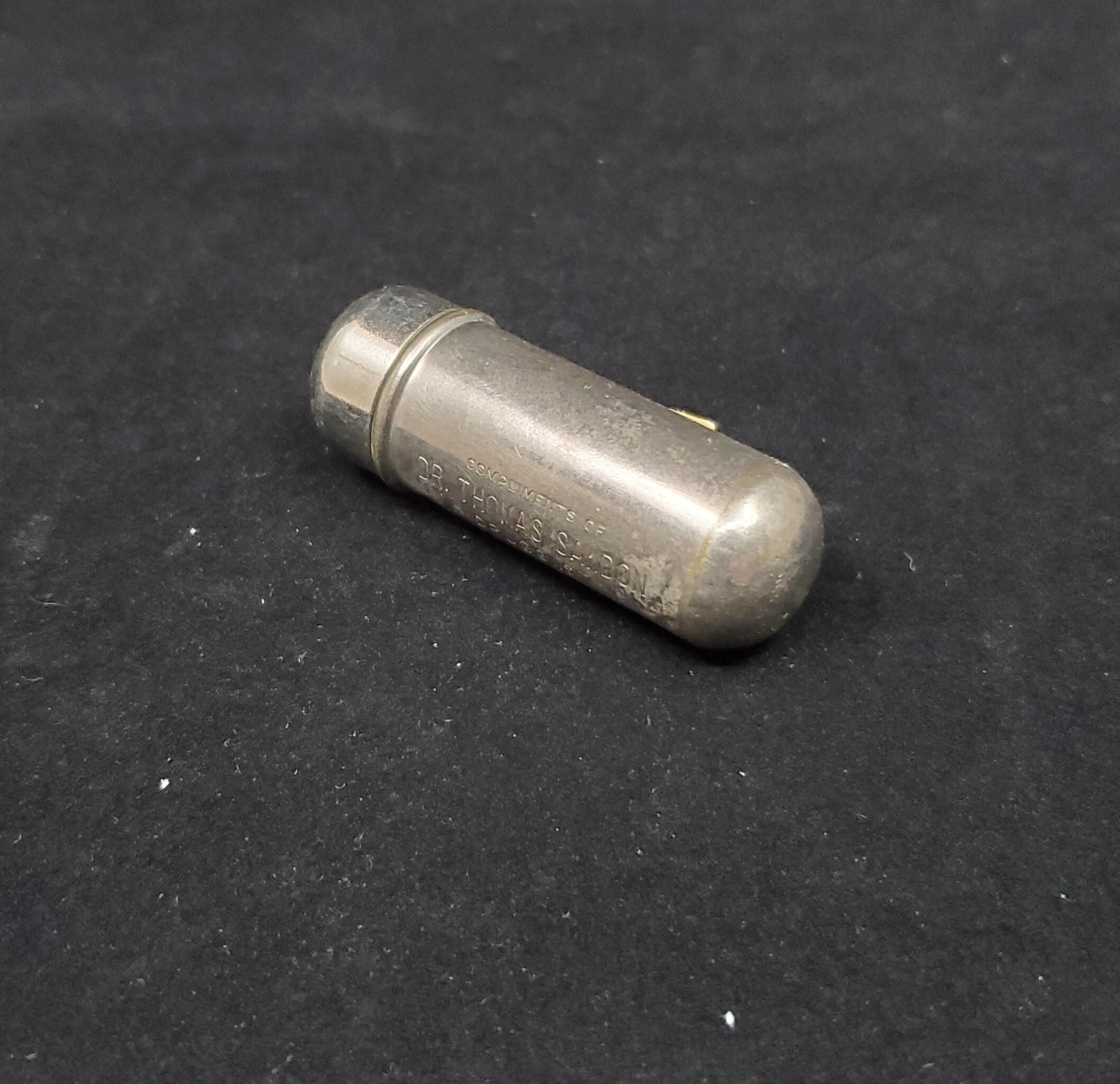 Nickel (?) bullet shaped sewing case stamped on utside ÒCompliments of Dr.Thomas Sawdon Three Hills AltaÓinside 2 thread metal bo bbin with insde hollow for pns etc. Metal top. Aluminum thimble also inside. Thimble - Aluminum thimble with rolled vertically lined rim. Wide plain band above then knurling to sand over top. Inside top has a T .