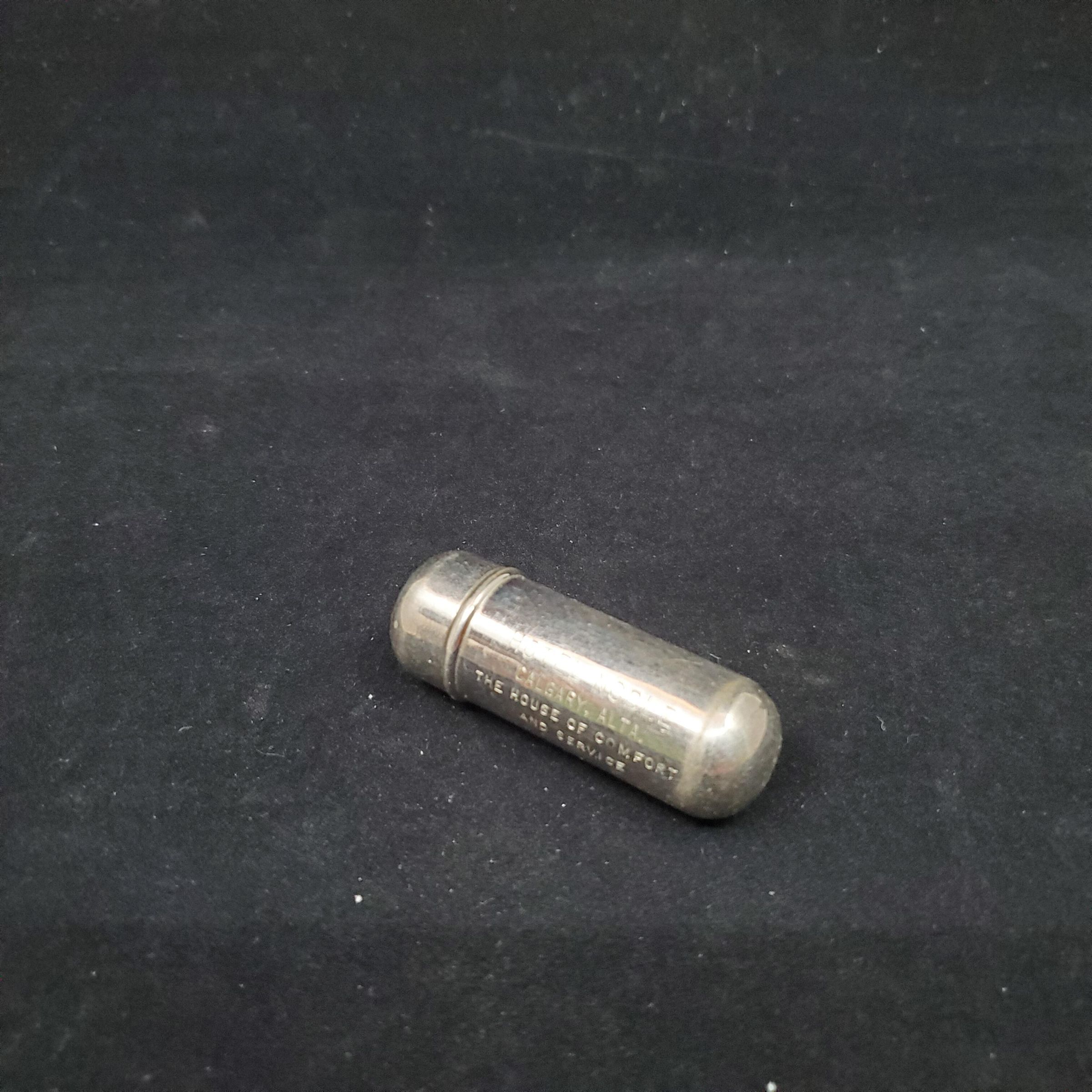 Metal - silver coloured case (nickel?), bullet shaped. Stamped on outside ÒHotel Nobel Calgary Alta The House of Comfort and ServiceÓ. 2 thread bobbin inside,center for pins etc. and metal thimble. Thimble - Metal - siver coloured - thimble with rolled rim. Narrow vertically lined band above rim, then a wide plain band with another narrow vertically lined band above. Size 6 stamped on plain band . Germany also on band. Knurling to and over top.
