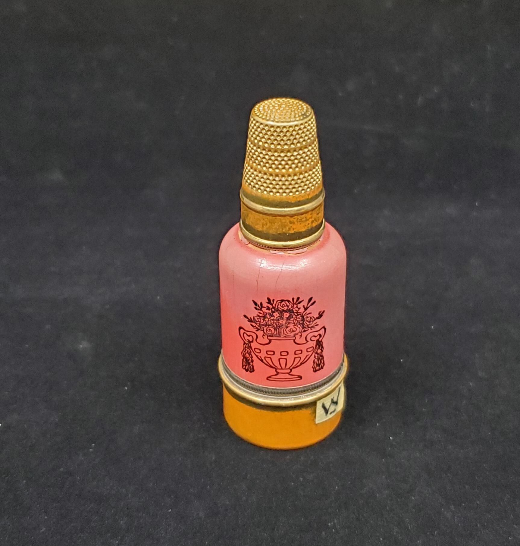 Pink metal case, bottle shaped with 2 elaborate urns of flowers around body of case.Top end has brass thimble which on taking off reveals a wooden 2 thread bobbin with brass tip to open into needle case, Lower end has mirror, open to reveal powder case with puff. Thimble - Brass thimble with wide plain band at rim then 3 tiers of knurling with 2 narrow plain lines between, Knurled on flat top.