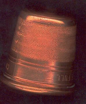Copper jigger in the form of a thimble 1 and 3/4 inch tall, 2 inch diameter. Rolled rim. Wide plain band with JUST A THIMBLE FULL and CANADA on it. Knurling to nearly top, plain smooth top. No marks.