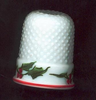 Jigger type thimble in white milk glass. Thimble shaped with slight fluting at rim. Red line at rim. Band of pattern above rim of green holly leaves with red berries. Thimble markings, raised, fro m pattern to and over top.Label, paper, inside reads ÒWestmoreland Glass Authentic Hand MadeÓ
