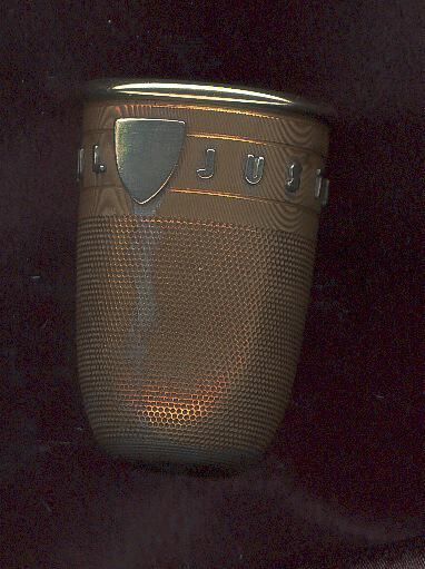 Brass drinking measure - holds 2 oz. with silver coloured rim, lettering and decoraton. Wide lined band above rim with a silver coloured badge and Just A Thimbleful around it. Knurling from here to and over top. No marks. Not sure what the silver coloured metal is - plate, nickel or silver.No marks.