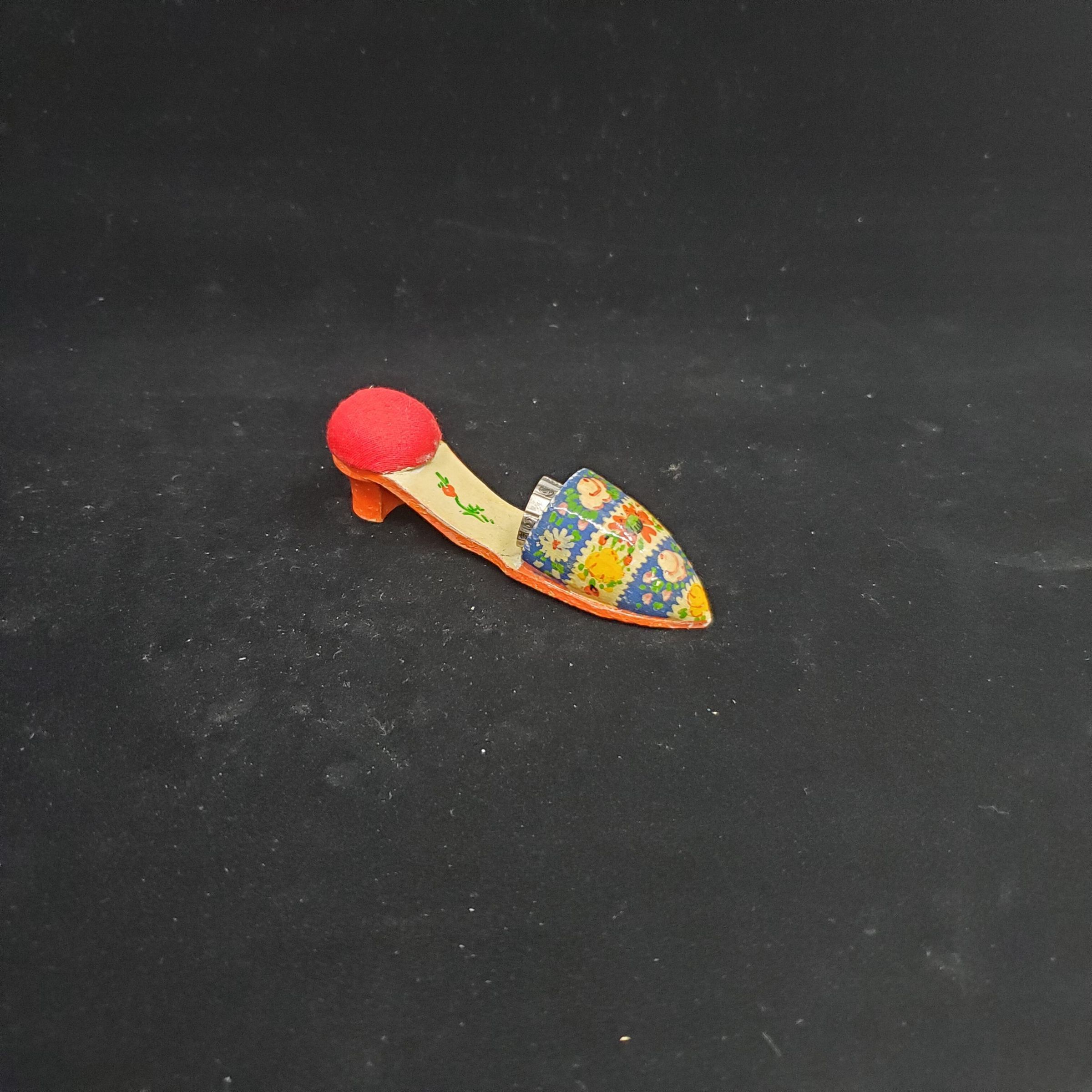 Wooden slipper thimble holder with pin cushion on heel. Hand painted in red, blue and cream with flowers. Red cushion . Signed T.F. on sole.