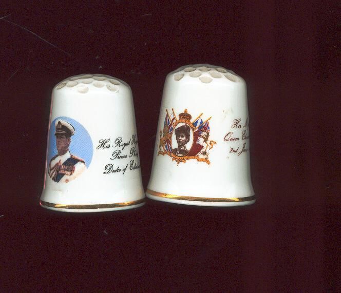 Pair of bone china Commemorative large size thimbles. White, fluted with a gold band at rim. Coronation thimbles. 1) Printed picture of Queen Elizabeth 11 plus Her Majesty Queen E.11 2nd June 1953Ó 2) Printed picture of Prince Philip with His Royal Highness Prince Philip Duke of Edinburgh. Inside stamped in blue ÒJohnson Ceramics Ltd. Fine Bone China Made in EnglandÓ and a crown.