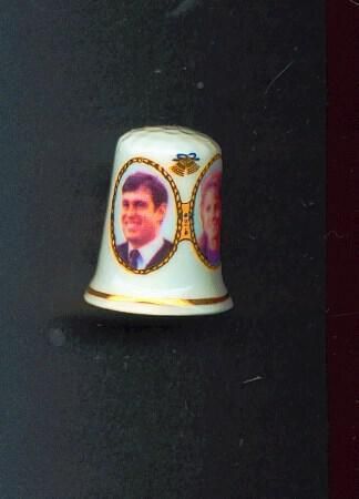 White glazed china slightly fluted Commemorative thimble. Commemorating the wedding of Prince Andrew and Sarah Ferguson. Printed pictures of Andrew and Sarah in oval frames with wedding bells above. Inside stamped B&W Ceramics Bone China Made in England.`