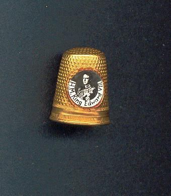 Large brass Commemorative thimble with rolled rim. Band above consists of narrow vertical lines, then a narrow plain band, then another lined band. Knurling from here to and over top. Applied paper disc of picture of H.M.King Edward VIII.