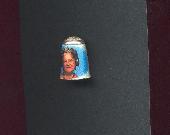 Commemorative silver enamelled slightly fluted thimble. White enamel background. Picture of the Queen Mother on blue background. Words printed in black on back ÒTo Commemorate the 9oth birthday of Her Majesty Queen Elizabeth The Queen Mother August 4th 1990Ó Inside cap stamped J.S.& S Lion Passant, anchor (Birmingham) and 2 (1990) Knurled top.