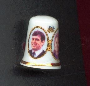 Whiter glazed bone china Commemorative thimble, slightly fluted at rim. 2 screen prints on thimble of Edward, Duke of York and Sarah Ferguson . On reverse in black print ÒTo commemorate their wedding at Westminster Abbey on Wednesday July 23, 1986Ó Gold band at rim. Stamped inside with a Crown and Bone China Made in England.