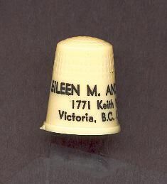 Creamcoloured plastic ÒPersonalÓ thimble. Black lettering with my name and address ÒEileen M. Anderson 1771 Keith Place, Victoria, B.C. Canada. Ò In apex is U.S.A. 1.