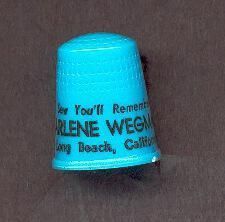 Blue plastic Personal thimble with black lettering. ÒSew YouÕll Remember Earlene Wegman, Long Beach, California. U.S.A. 18 (mold number) in apex. Thimble with raised rim, wide plain band above rim with name, then 4 rows of square knurling to top. Round indentations over top.
