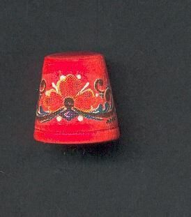 Red wooden thimble with indented line near lower edge to give effect of rim. Painted formal design, signed Anri.