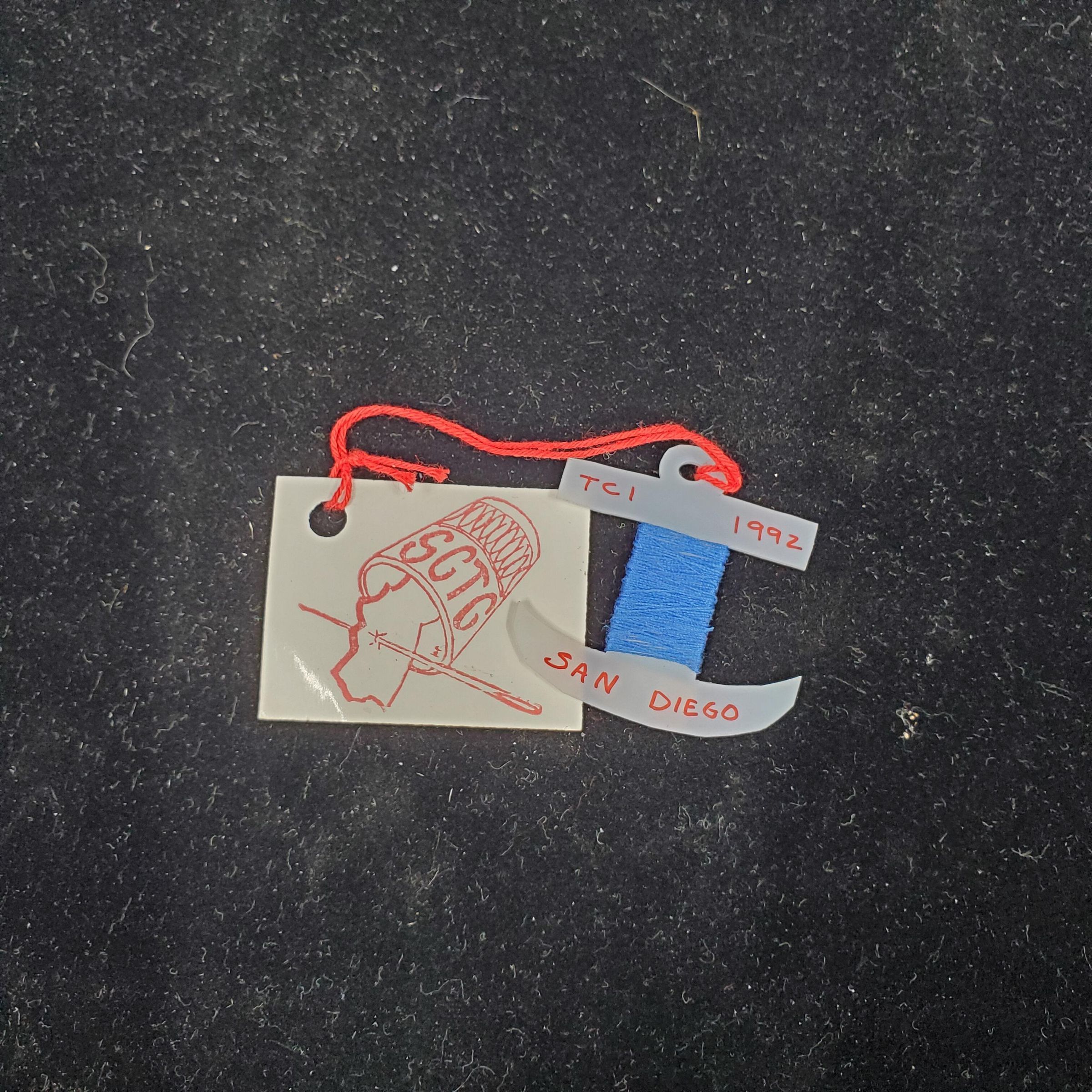 White plastic thread wnder in shape of anchor. Wound with blue thread. Red print reads 'TCI 1992 San Diego' White tag with winder has red thimble with map of California in ir with a needle going through San Diego. Thimble reads SCTC
