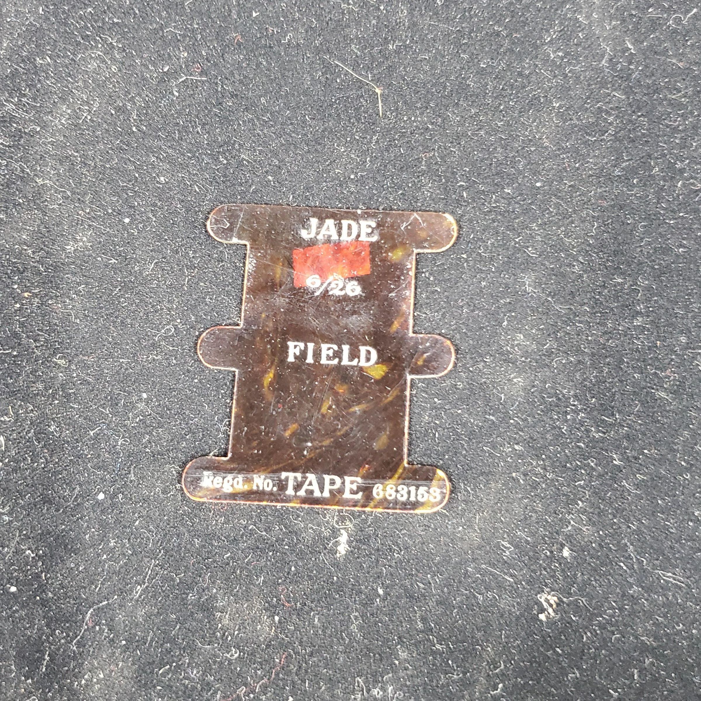 Advertising mock tortoise shell thread winder. Gold print reads 'Jade 6/26 Field Tape Reg'd No. 683163'