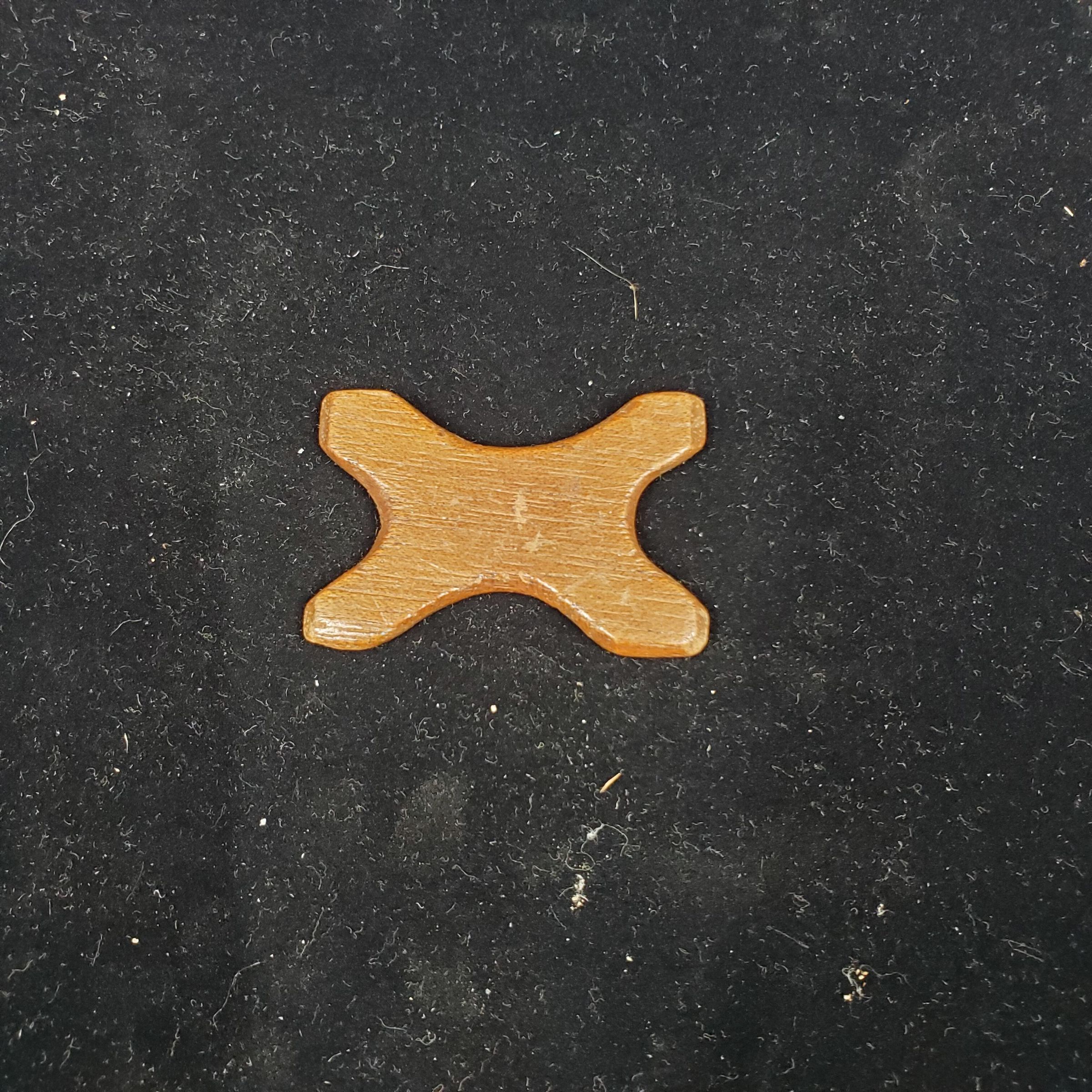Dark brown wooden thread winder. Basically rectangular with curves.