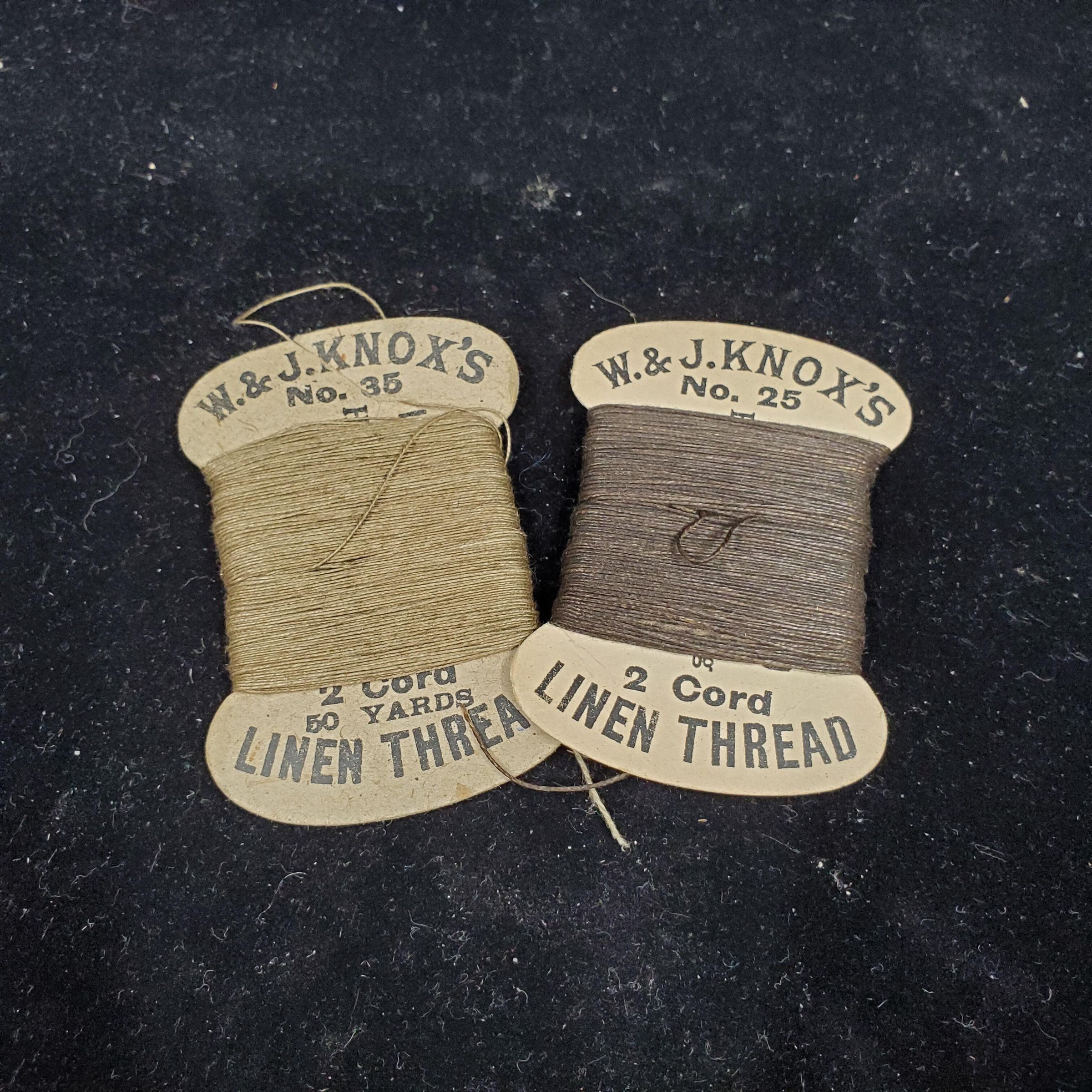Linen thread on 2 cardboard thread winders. One has dark brown thread. 2 cord #25. The second has a lightwer brown lnen thread, 2 cord, # 35. Both have W & J KnoxÕs and 50 yards on the cards.