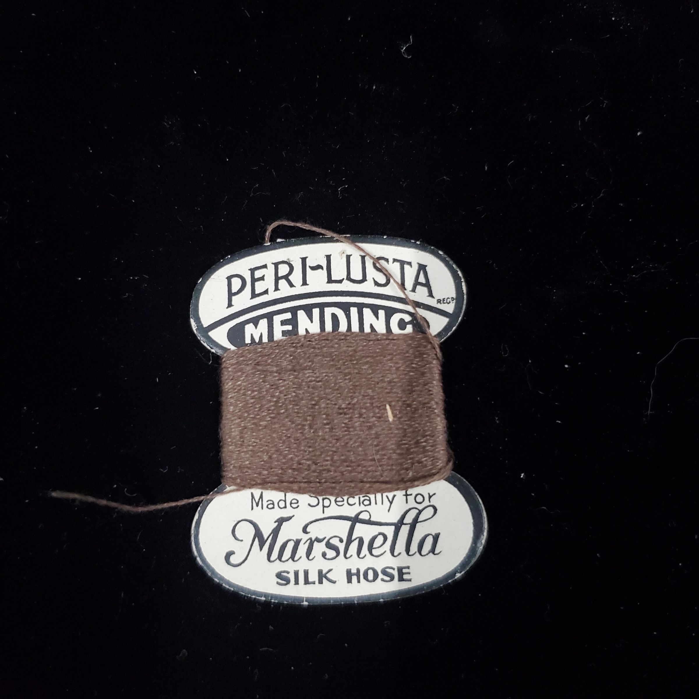 Cardboard thread winder with thread. White with black. Dark brown thread. Reads ÒPeri-Lusta Mending Made Specially for Marshella Silk HoseÓ. On back instructions for use.