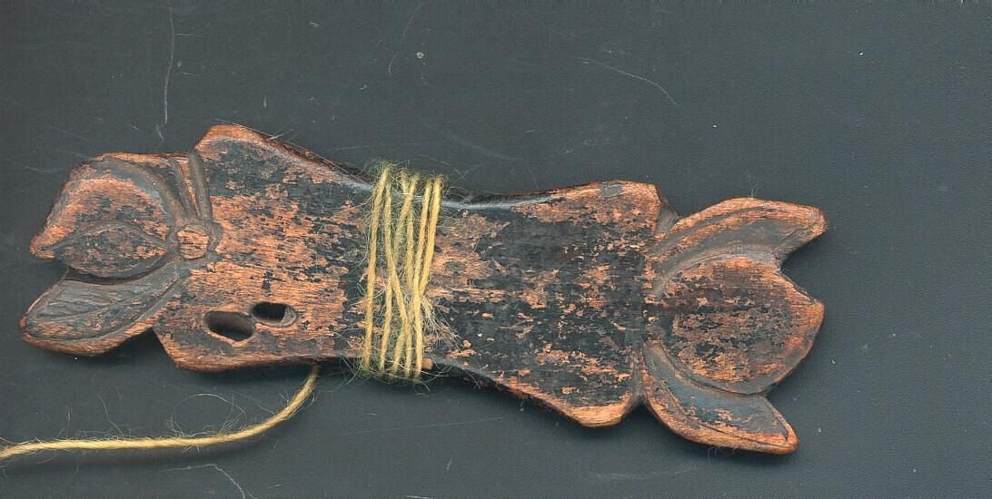 Wooden thread winder with carved flowers each end. Note with it says Antique Chinese Thread Winders - used to hold small amounts of precious silk threads - ornatey carved and decorated. Bit of green thread wrapped around it.