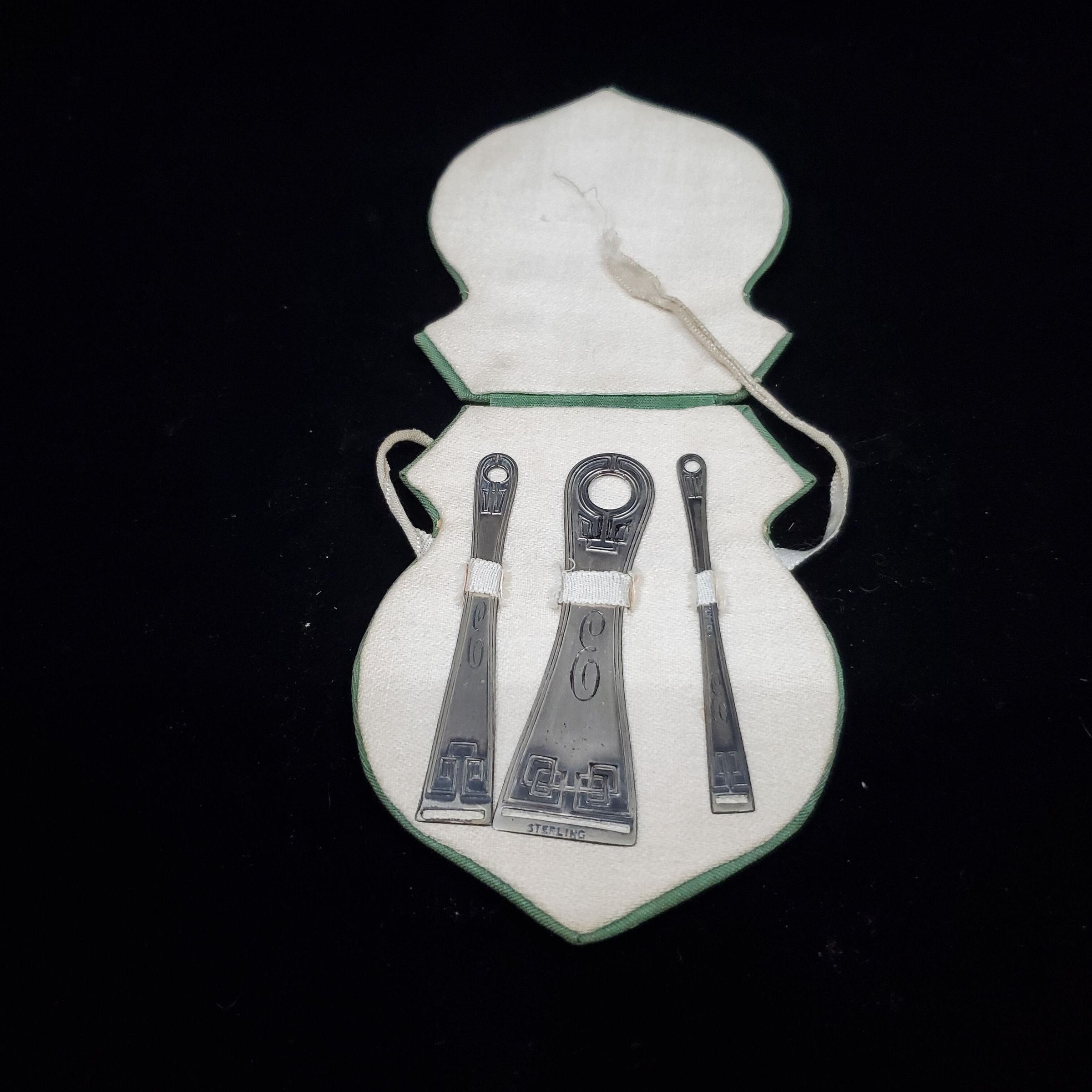 Silver ribbon threader set in green (outside) and white (inside) moire silk case. 3 sizes threaders with initial E on them and design at top and bottom of threader. Stamped Sterling