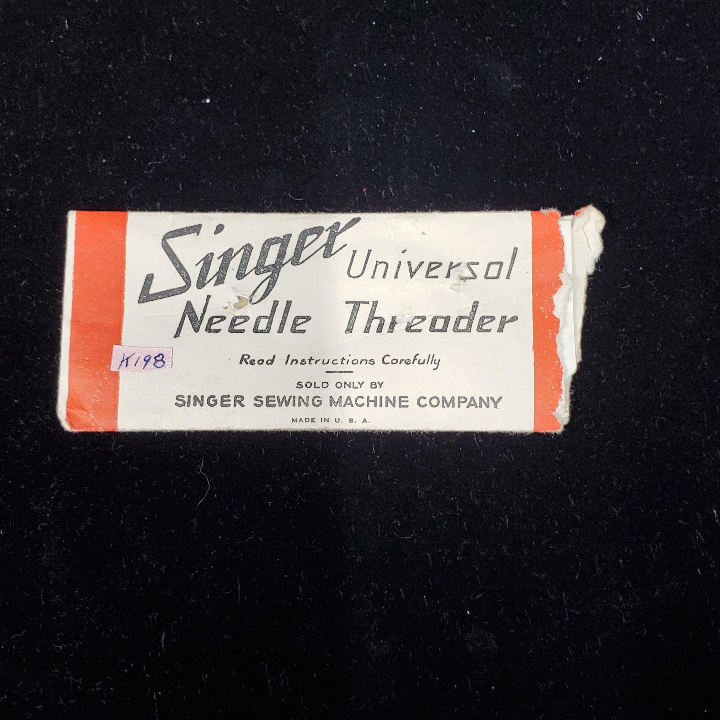 Inside Singer envelope for Universal Needle Threader was 1) page of instructions for use 2) Metal needle rhreadee with red circle around head of lady,stamped Japan in red print 3) plastic small envelope with 2 small metal pieces.
