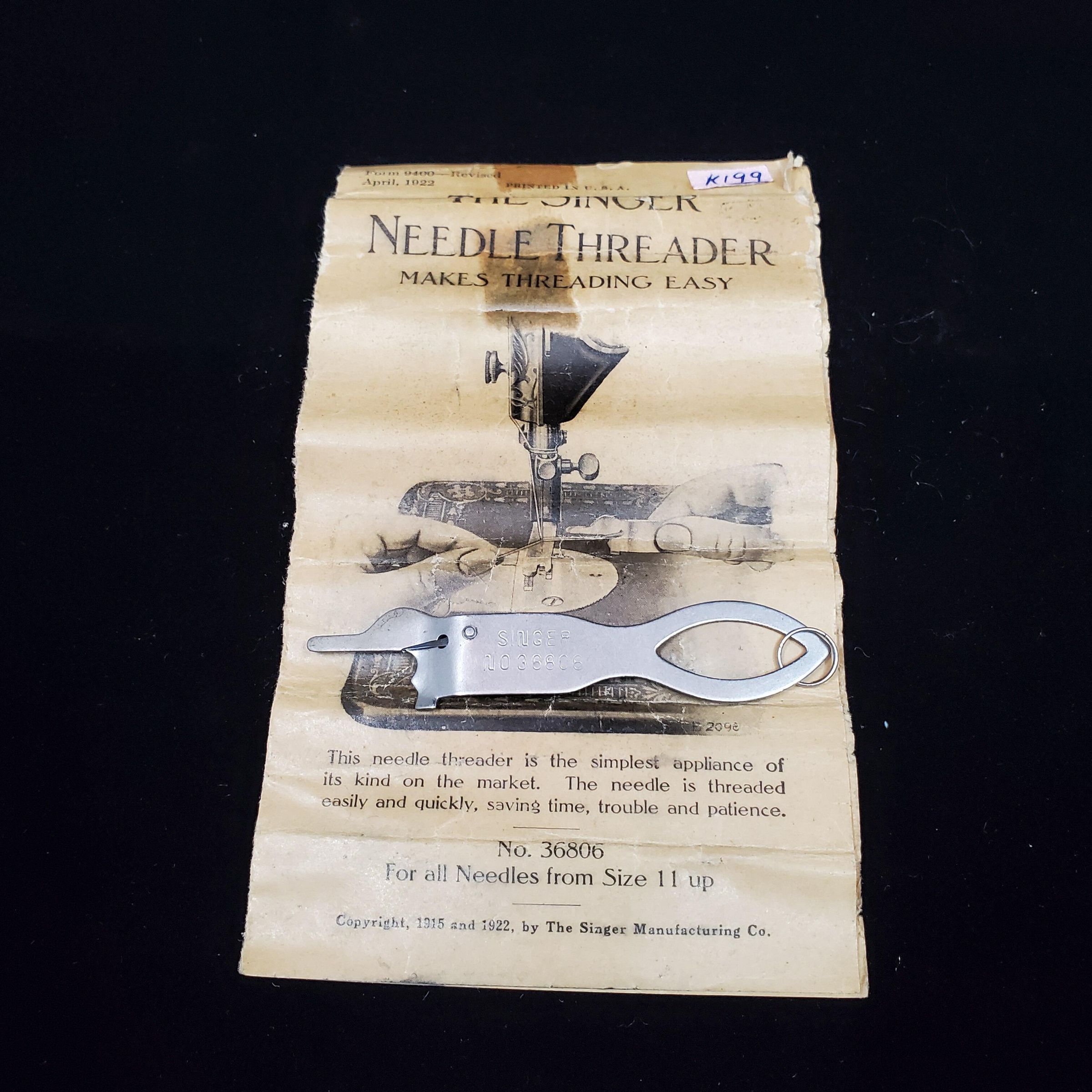 The Singer Needle Threader - metal threader for Singer sewing machines. In brown envelope - original package. Form 9400 - Revised Apr. 1922