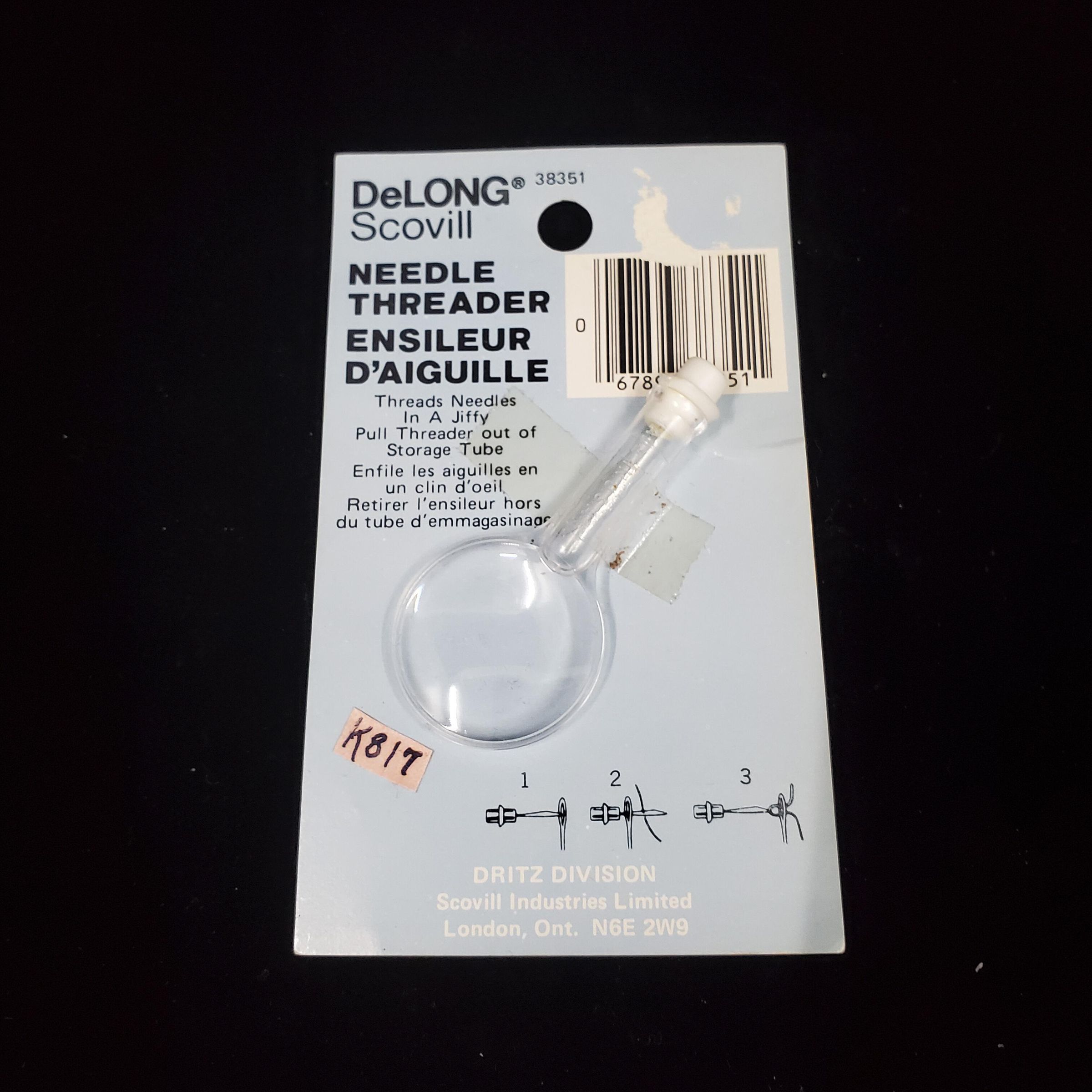 Needle Threader. On blue card. Small magnifying glass with tube handle - threader in handle. English and French directions on card. ÒDeLong Scovill Needle ThreaderÓ London, Ont.