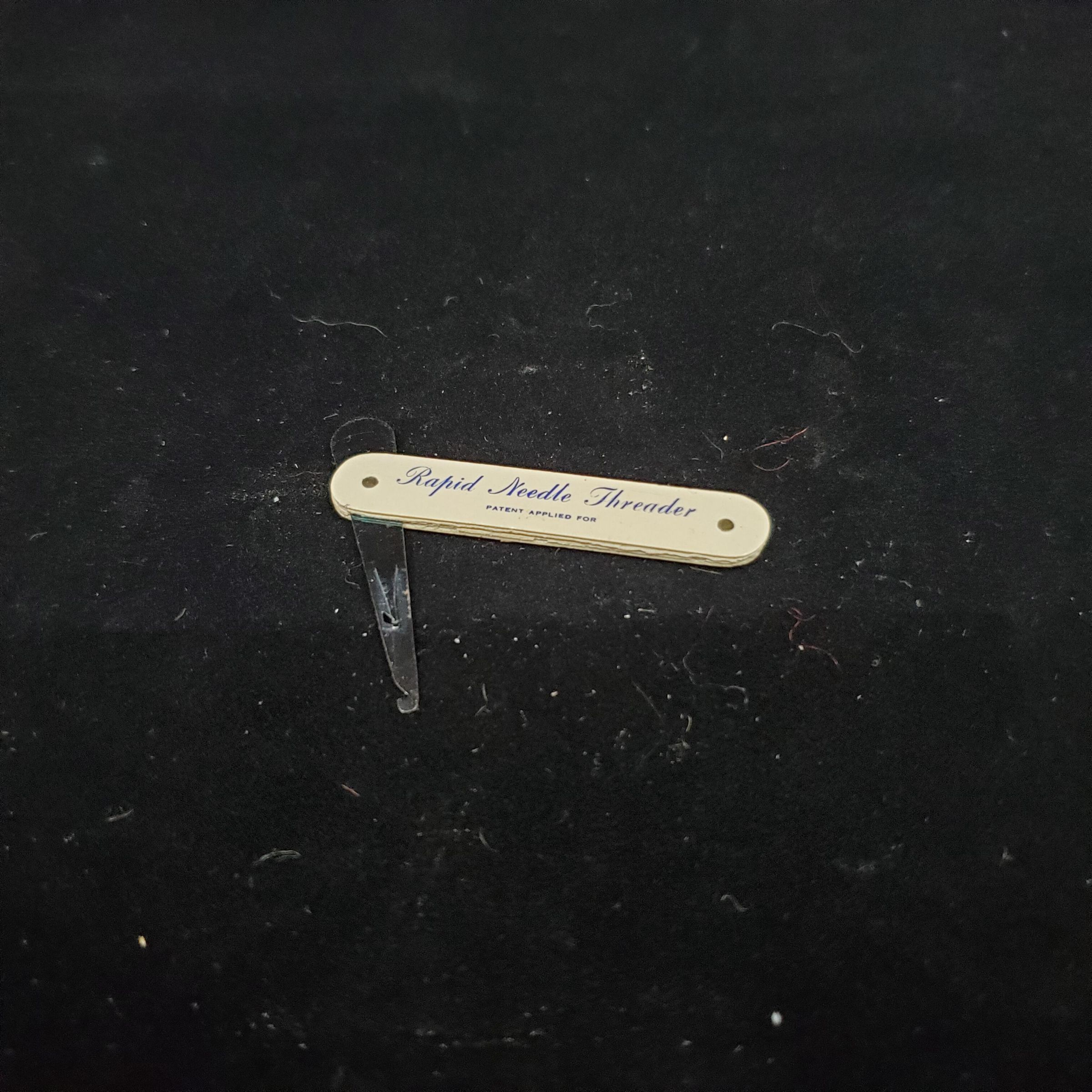 Needle threader in cream coloured plastic sheath. Blade opens out.Printed in black on outside ÒRapid Needle ThreaderÓ and ÒPatent Applied ForÓ