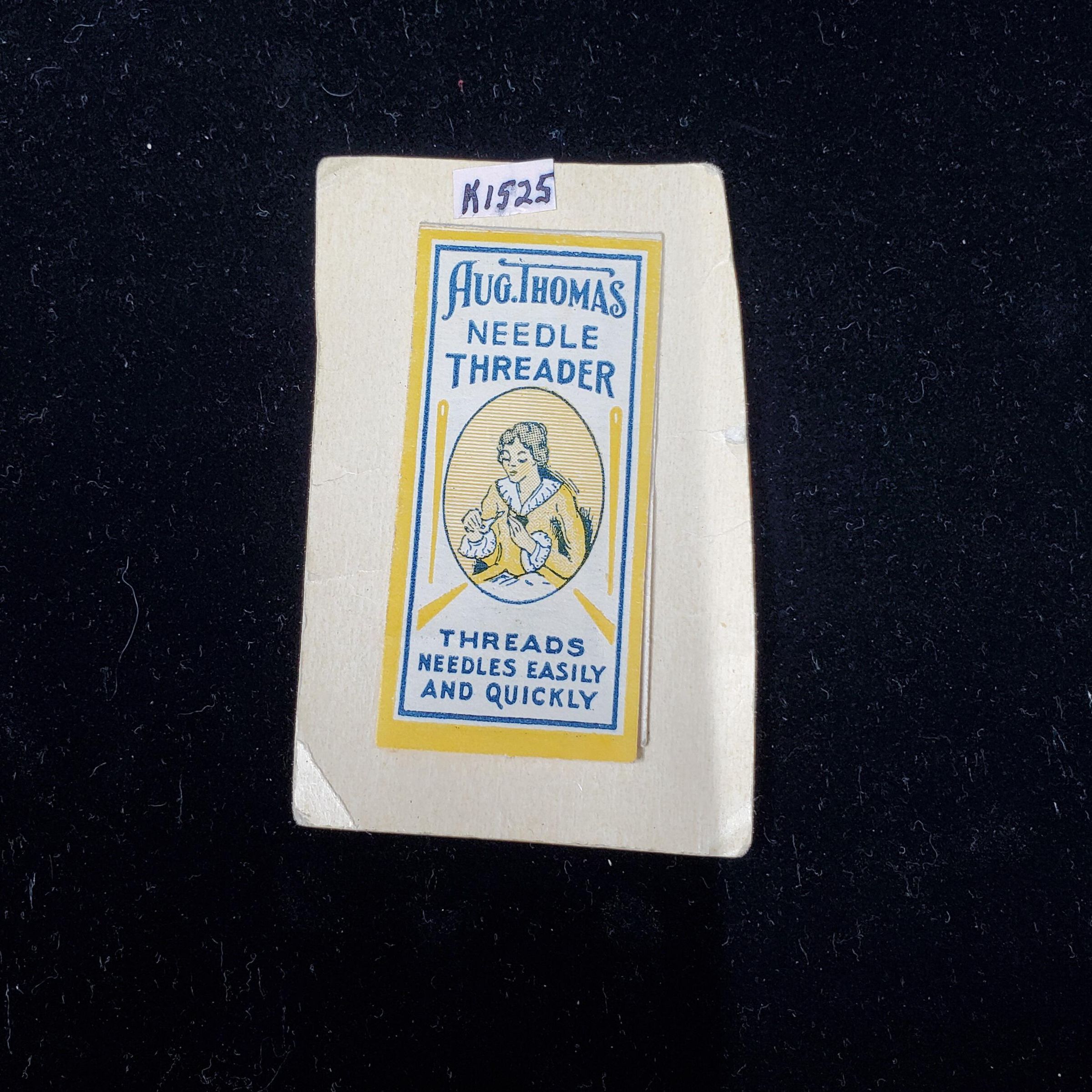 Paper Folder - white, blue yellow colours, contains needle threader. Cover reads Ò Aug. Thomas Needle Threader Threads Needles Easily & QuicklyÓ Threader instructions inside. Top of threader is red colour.
