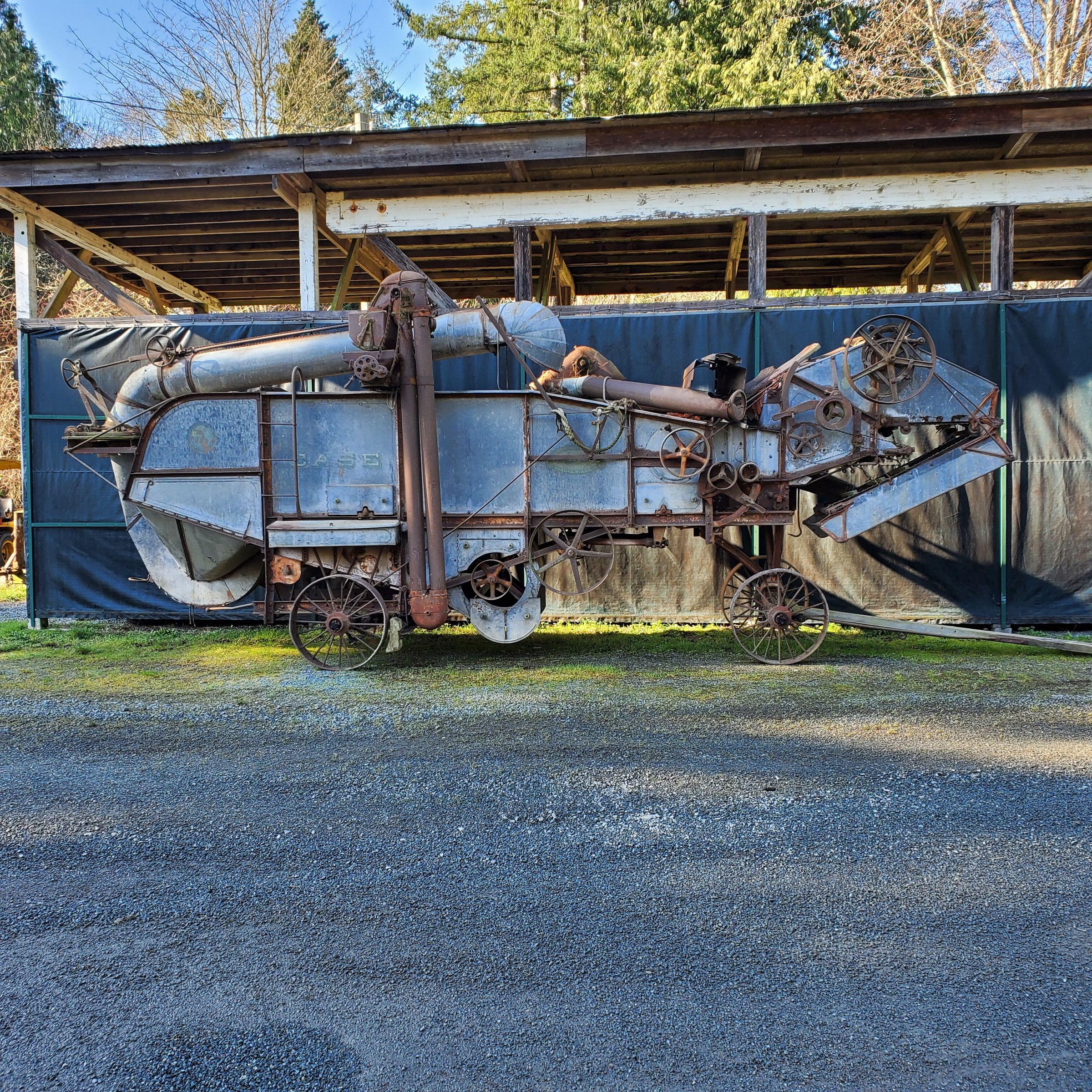 Built between 1912 and 1917 by the J.I.Case Company. This model is a 54 inch with optional brakes with a 32x32 cylinder. It is described as a wind stacker, feeder, #1 wade with cross conveyor and wagon spout. Orginal cost was 960$