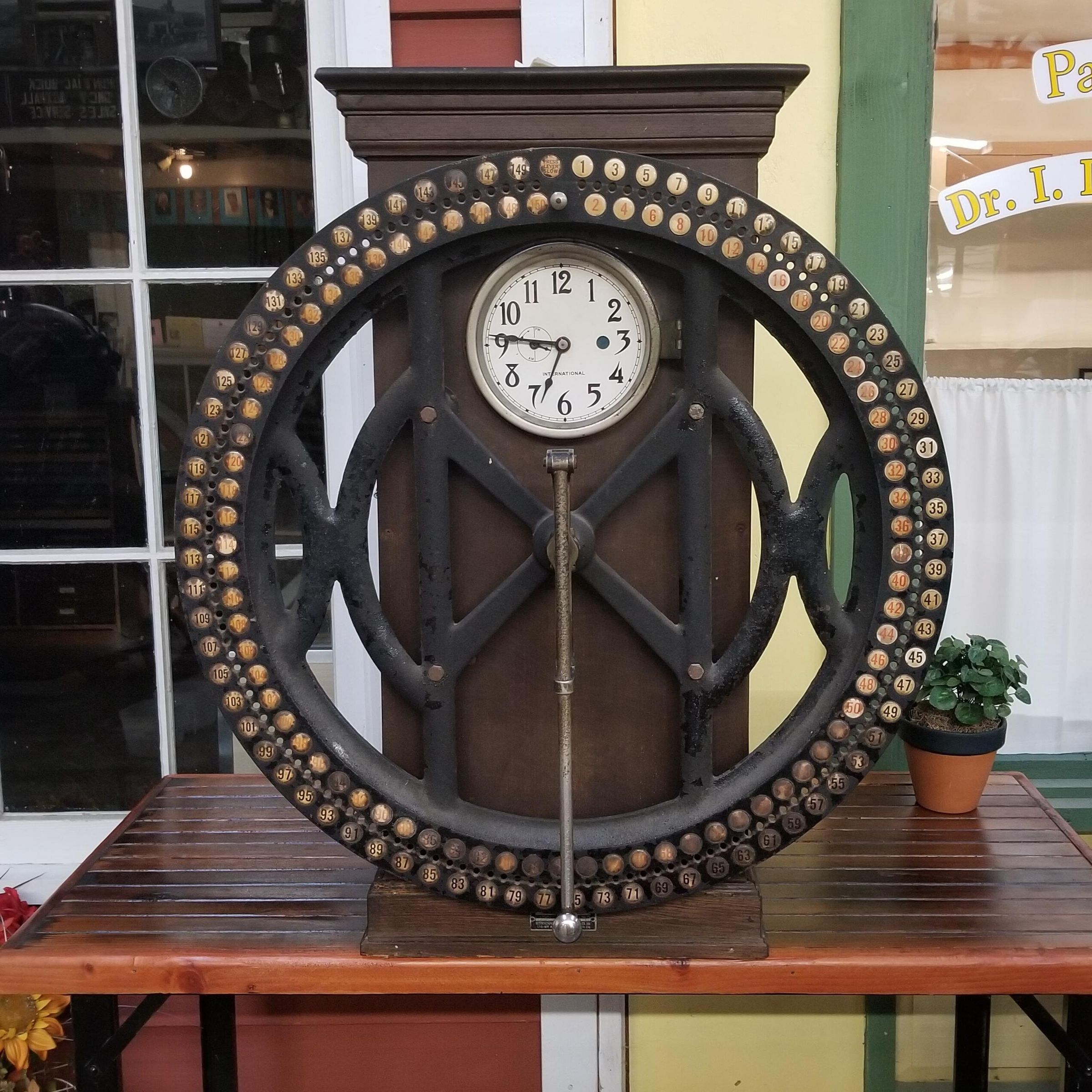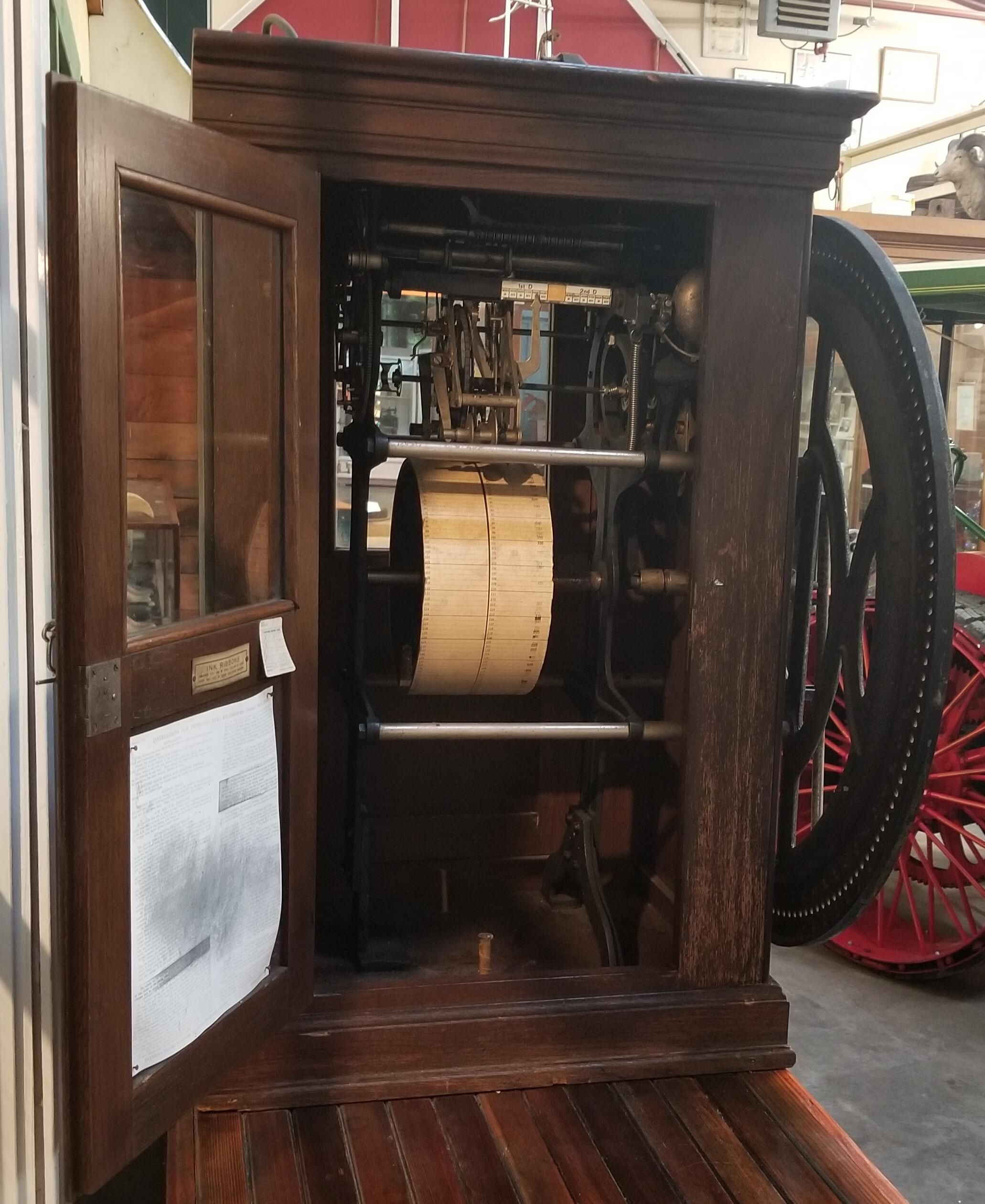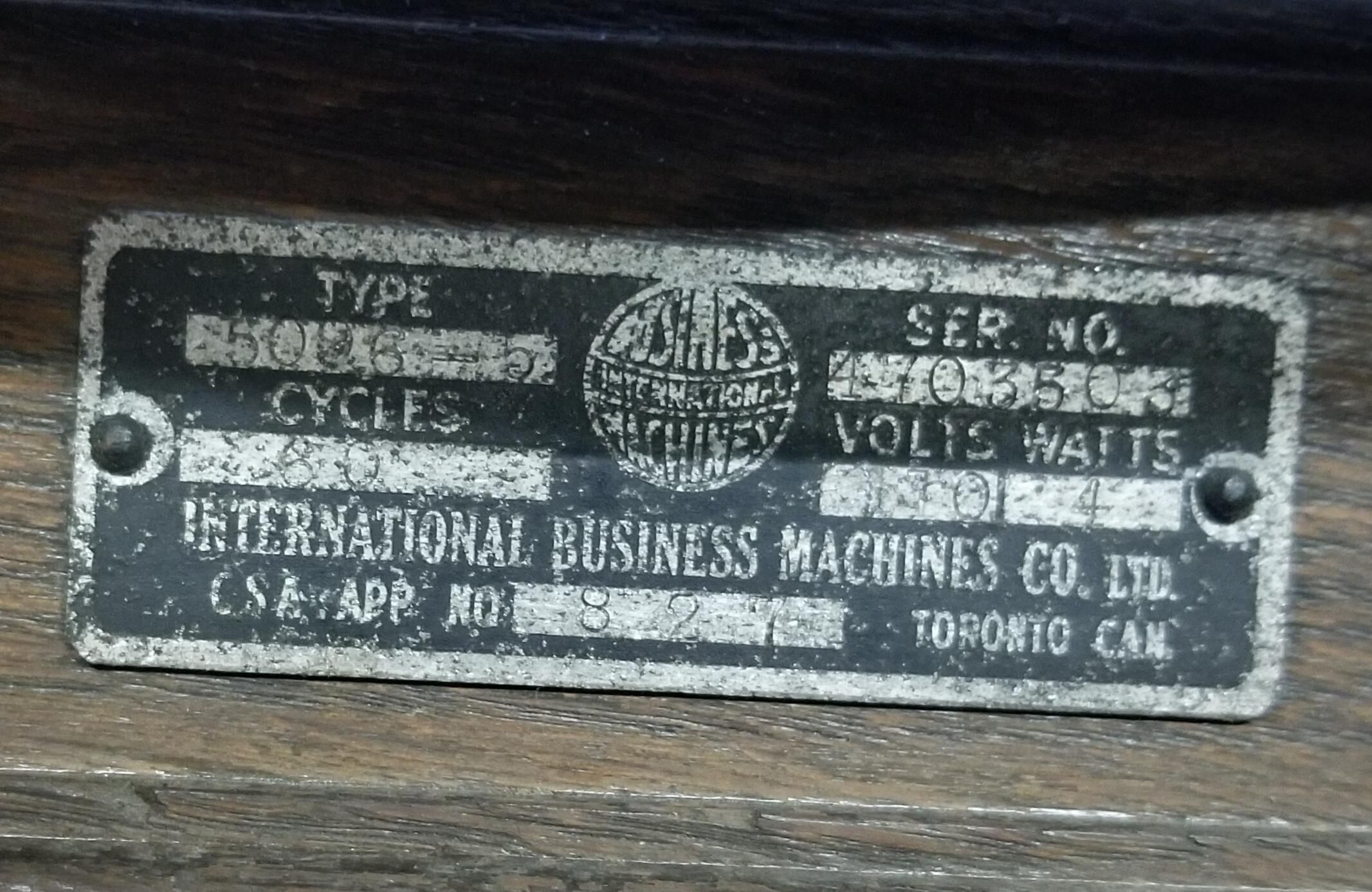 Numbered wheel with clock mounted on wooden cabinet. The interior of the cabinet has two paper rollers and printing mechanisms. This 'Improved Dial Double Drum' model was manufactured by International Business Machines Company Ltd., Toronto Ontario. Includes instructions.Use