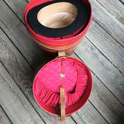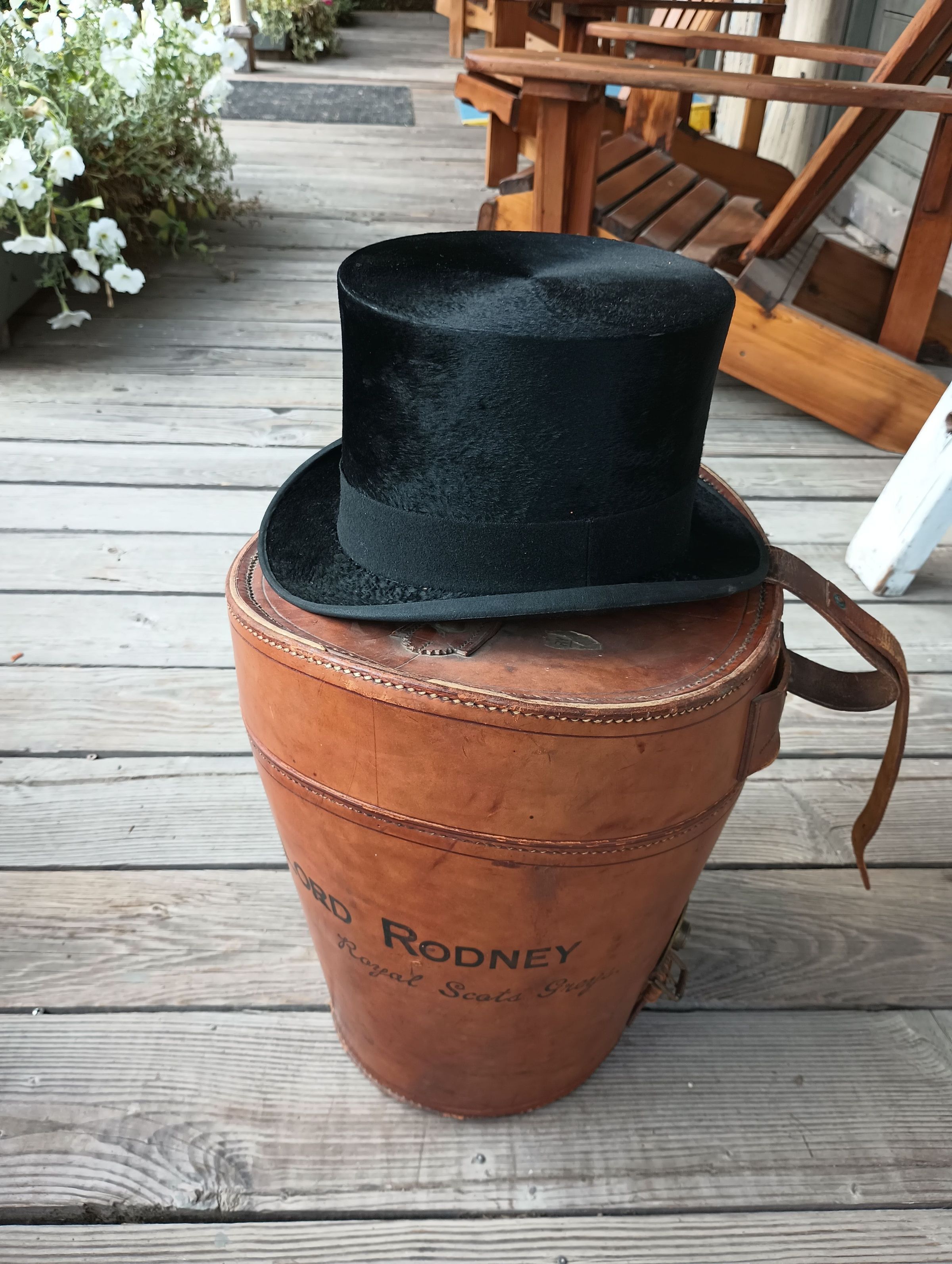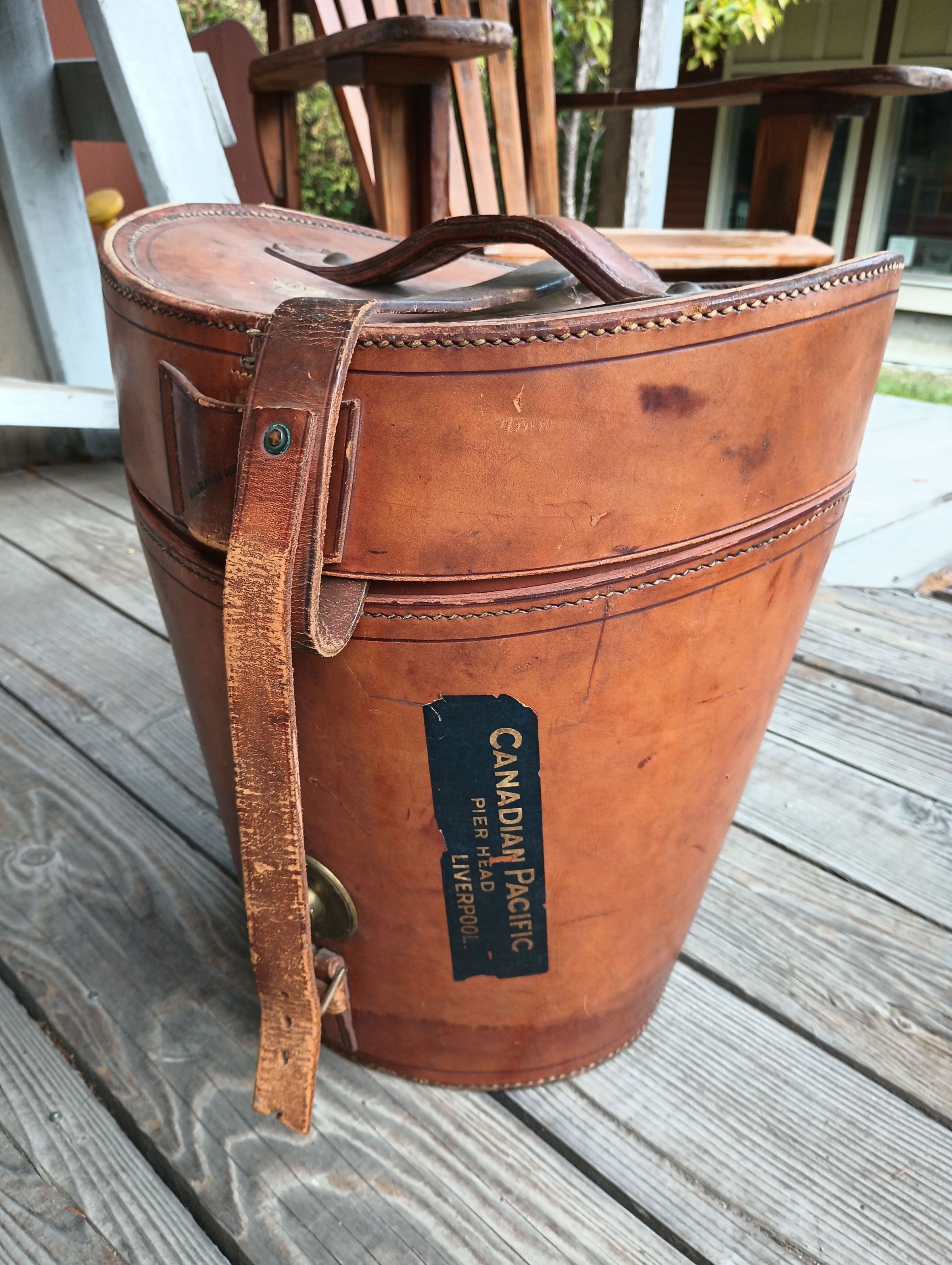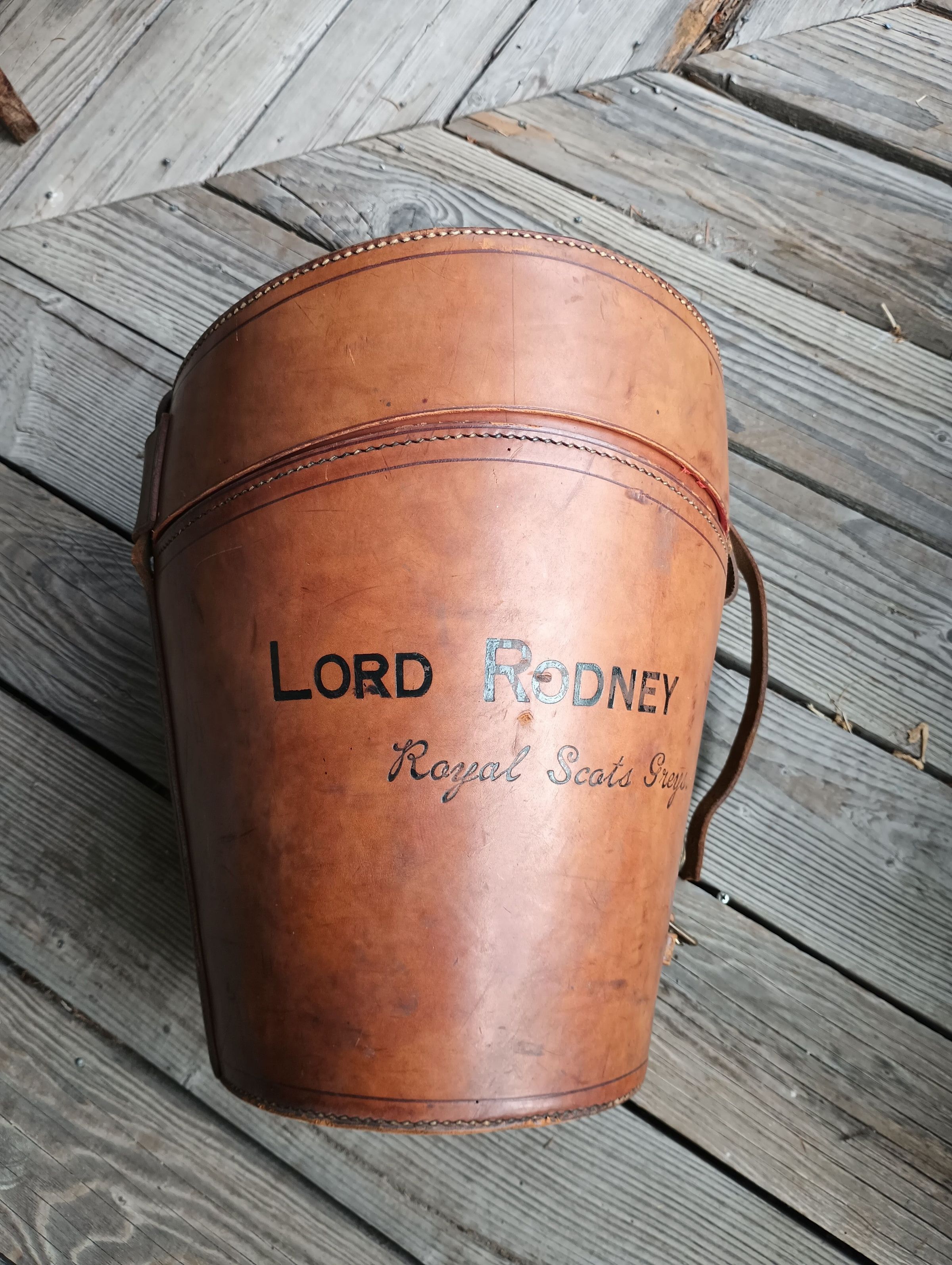 The leather hat box is marked Lord Rodney Royal Scots Greys and has a 'Canadian Pacific Pier Head Liverpool' label.Context