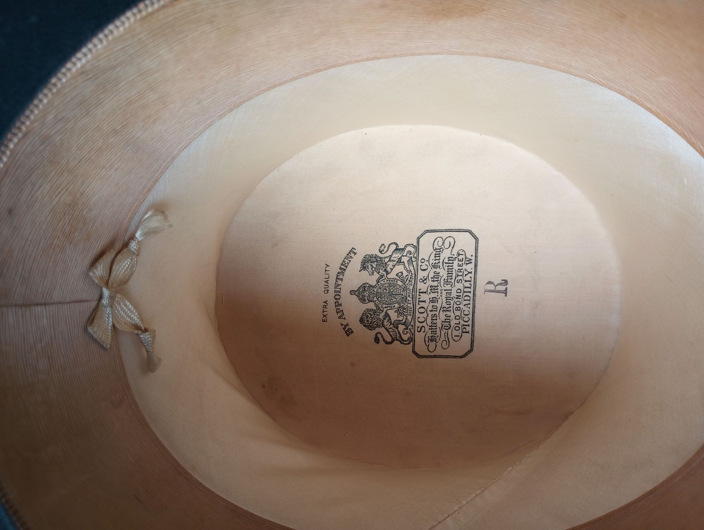 The hat label reads: " Extra Quality By Appointment Scott & Co. Hatters to H.M. the King and The Royal Family, 1. Old Bond Street Piccadilly W."