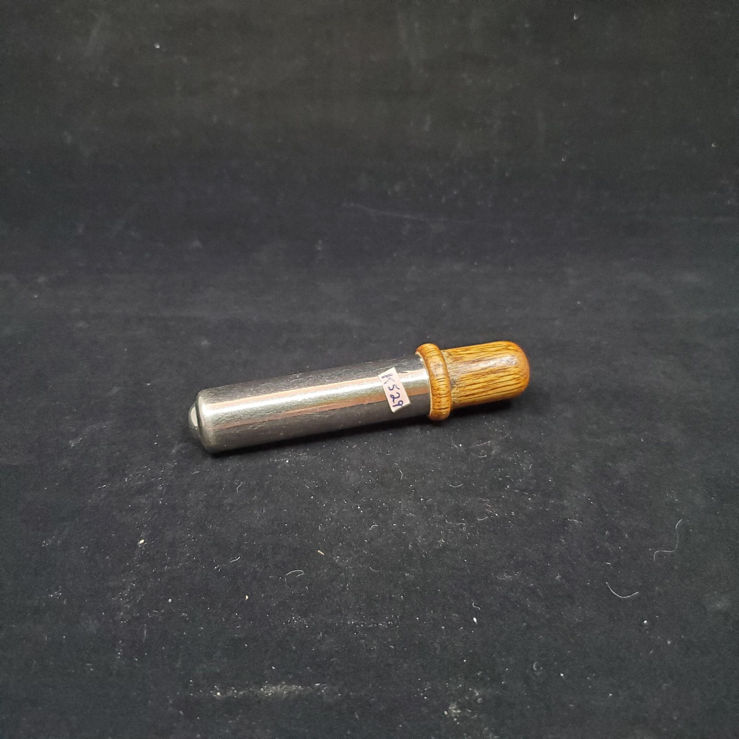 Tracing Wheel in case. Lower part of case is silver coloured metal. Top is medium brown coloured wood and forms the handle of the tracing wheel inside. Tracing wheel is steel. Wooden top slips into lower case.