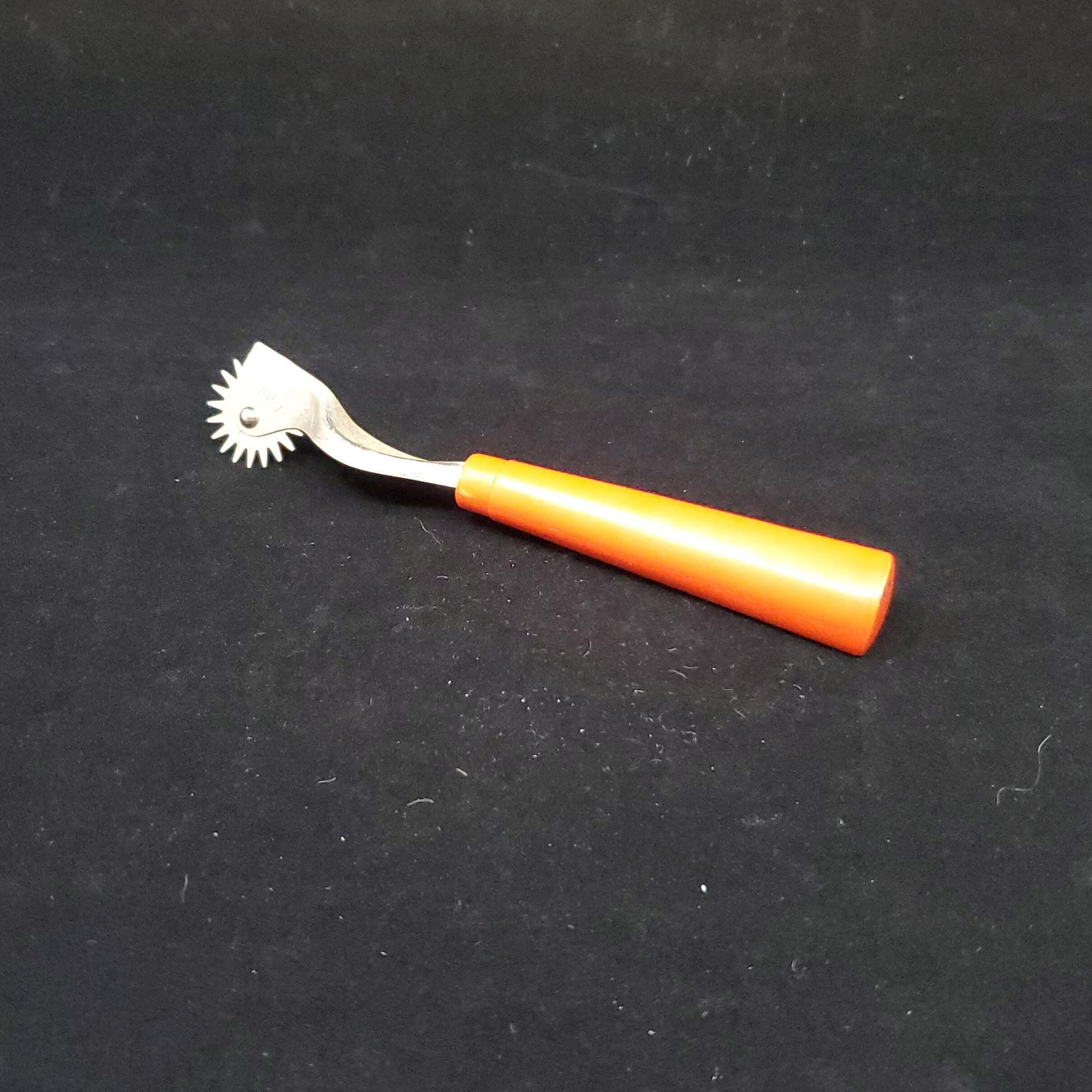 Orange plastic handles , metal-steeel - pattern maker. Metal rest for thumb or secind finger. Rest has rose in center with diamond li es around. Marker stamped ÒFavorit ges-geschÓ and blad itslef has words ÒQualitat SpitzenÓ