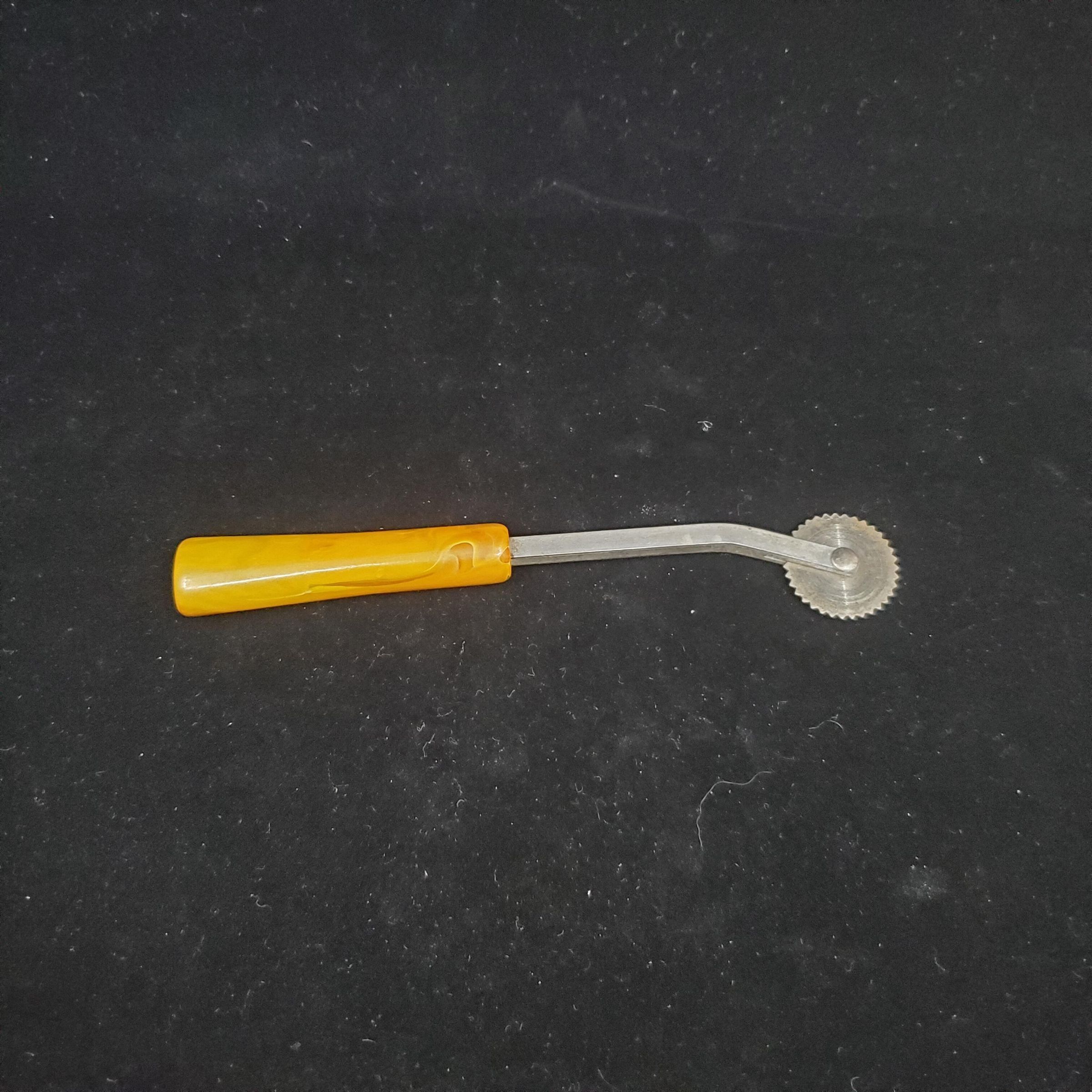 Bakelite handled tracing wheel, single head. Yellowish brown bakelite handle.