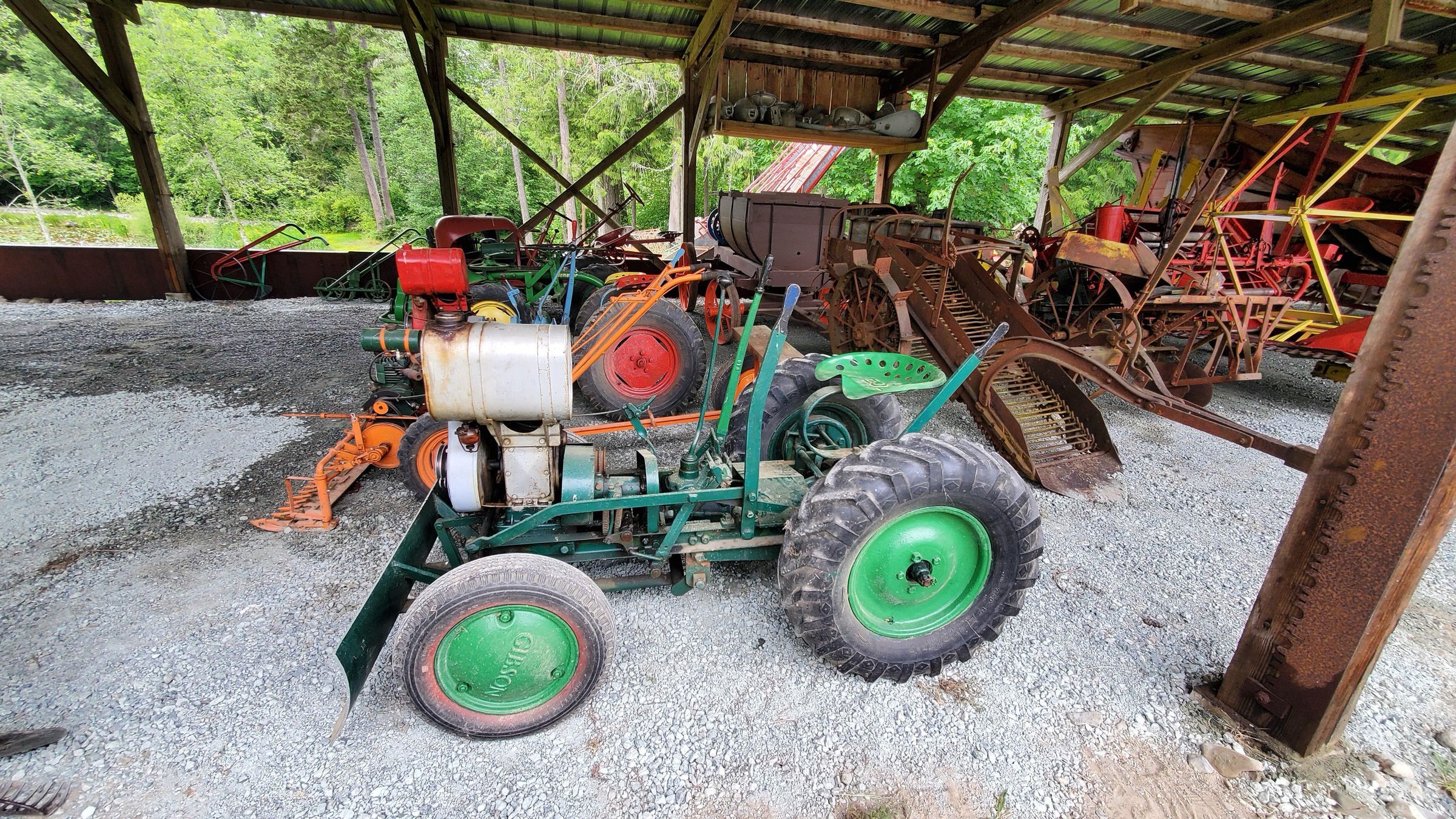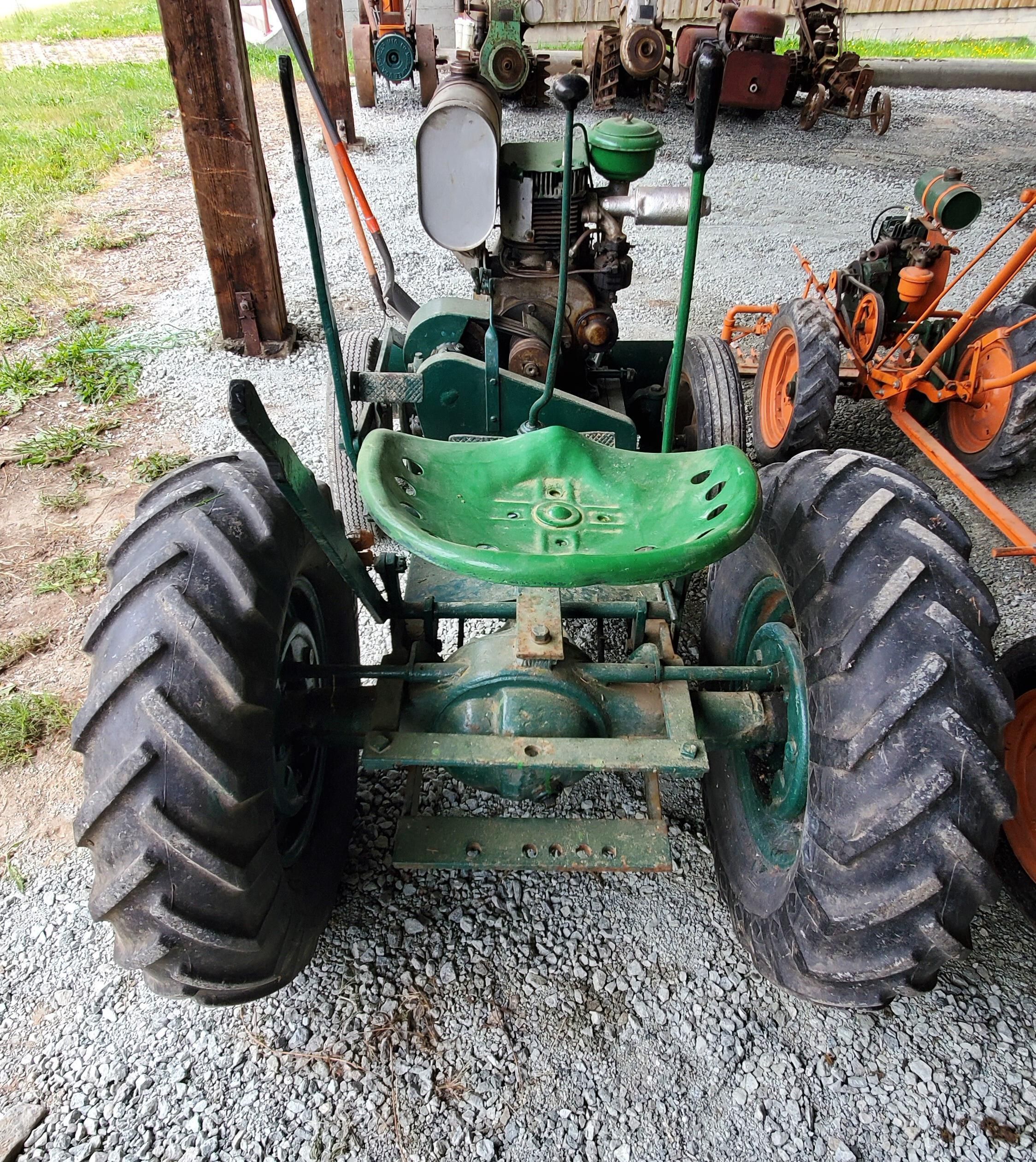 The transmission is very similar to a Gibson model A's. The rear wheels are adjustable on the D's. This made it possible for the plow to fit correctly. I believe there was also a front bumper option due to photos I have seen. You didn't need a battery due to the fact that elbow grease was the only way to start it. All you had was a rope. The rear hitch was moved by a lever. This was a metal bar spring loaded that was used to connect the attachments. Some Gibson's had a air cooled motor it also featured a simplified clutch. They are very hard to find and as all old tractors they are worth much more today than when they were new.