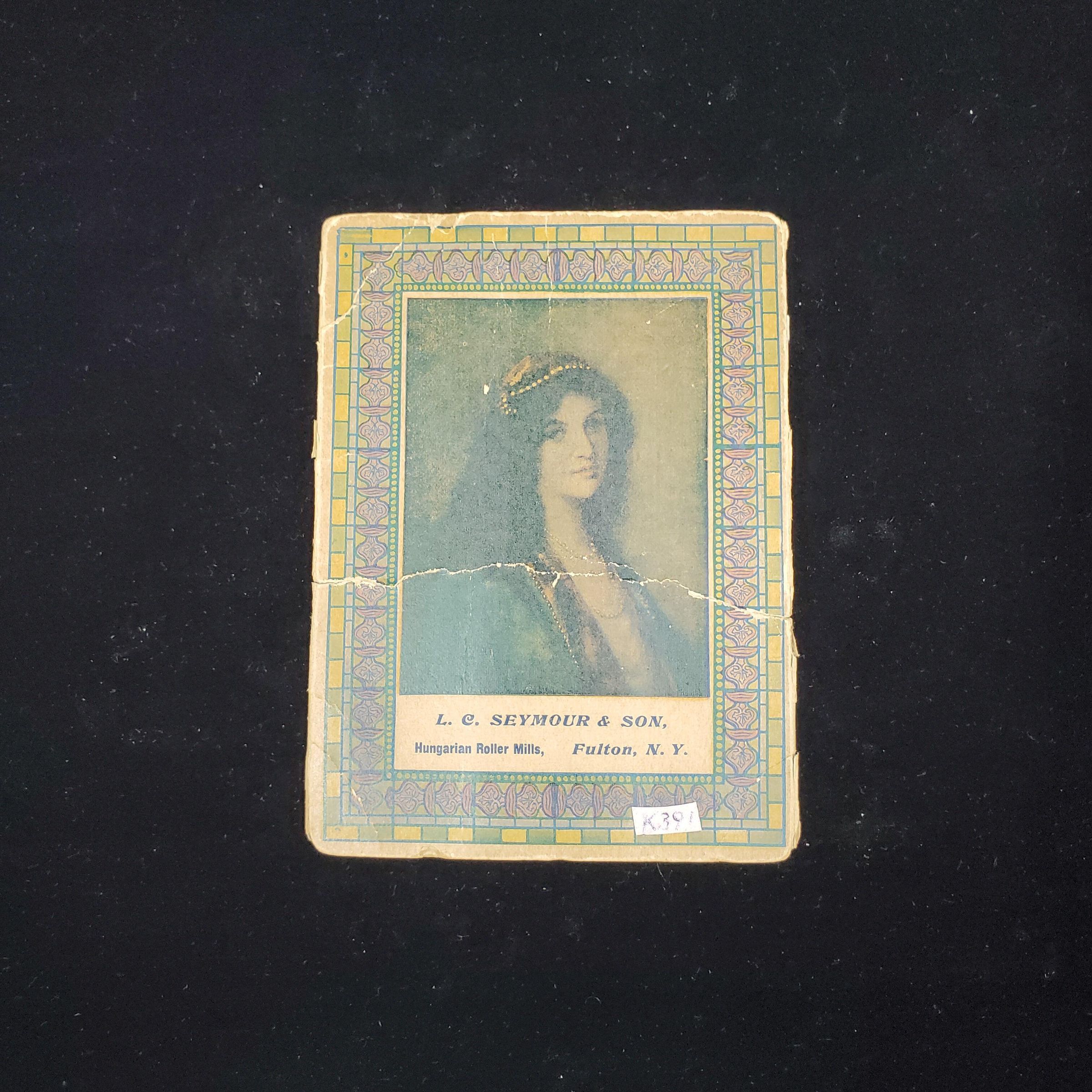 Cardboard Advertising type needle book..Front cover picture in frame of head of woman with L.C.Seymour & Son, Hungarian Roller Mills, Fulton, N.Y..Back has several ÒAjax Flour MelodiesÓ printed..Inside packet of needles, cloth with needles and calendar for years 1905,1905. More poetry re jax Flour.