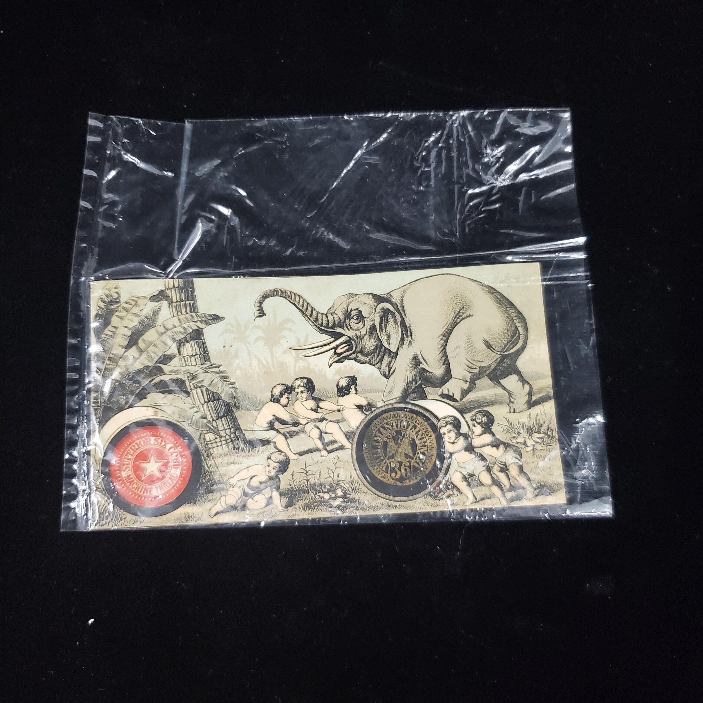 Sewing Advertising card.Colours - gray,black, white and red. Front shows many children pulling elephant with ÒSuperior Six Cord Machine ThreadÓ and ÒWillmantic Linen ThreadÓ Back has advertising with name of dealer ÒW.H. Farnham Dealer in Dry goods & Notions Palmyra N.Y.Ó