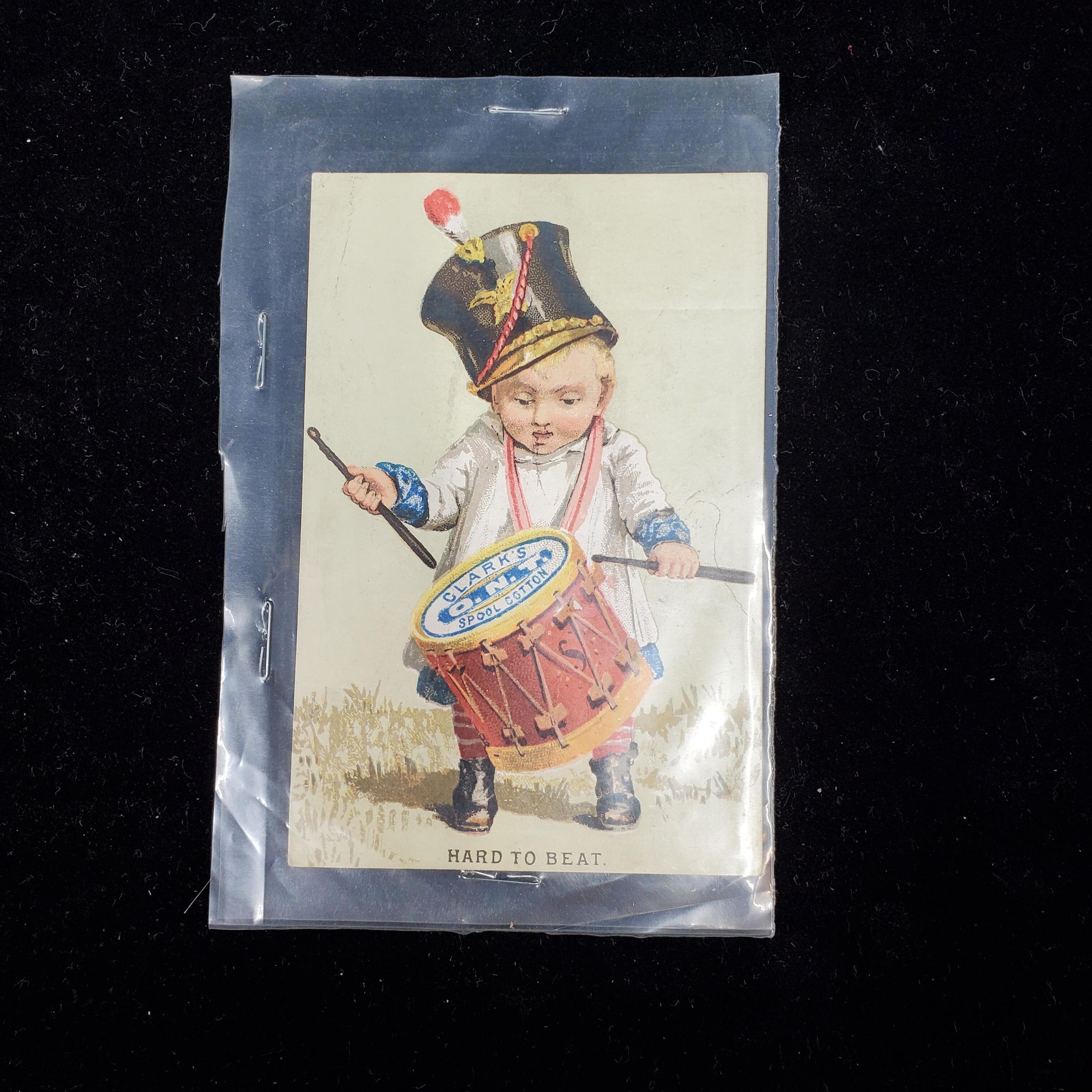 Light weight cardboard Advertising trade card showing young boy playing a drum. End of drum advertising a spool of Clarks Spool Cotton. Back of card is printed advertisin g for Clarks ONR Spool Cotton.