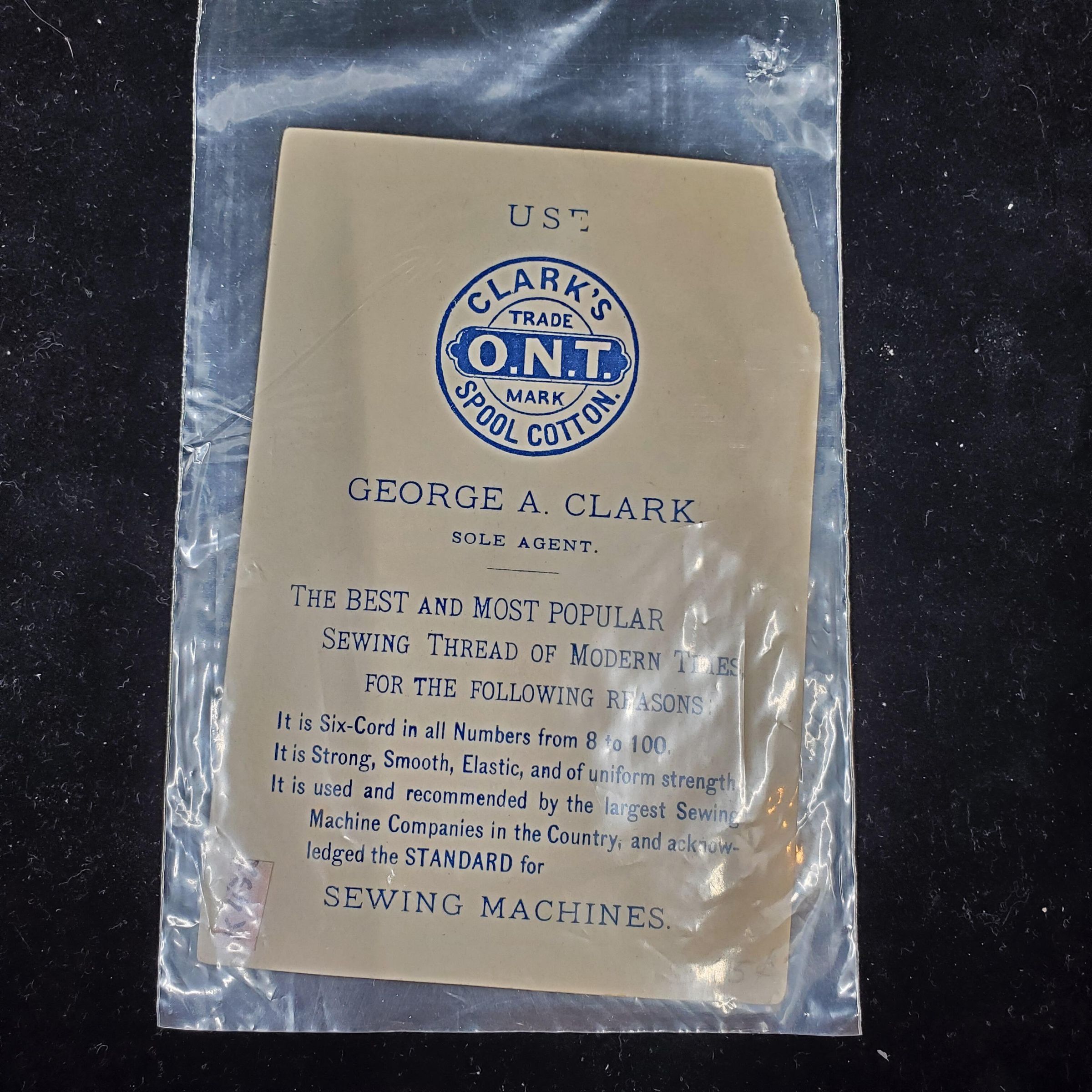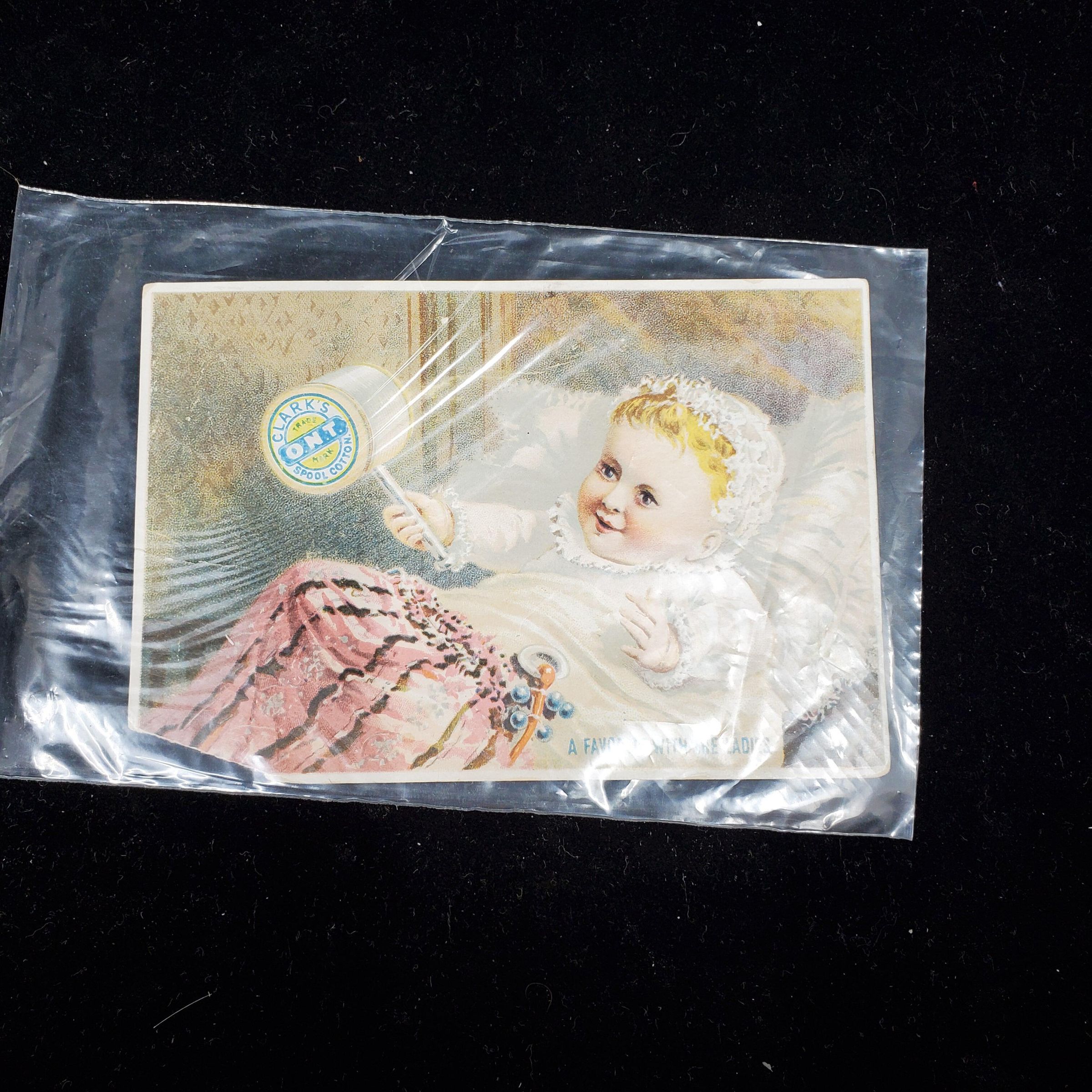 Advertising trade card with picture of babt with a rattle made of spoo l of thread and words in blue print ÒA Favorite With The LadiesÓ Thread is Clarks ONT Spool Cotton. Back has printed advertising for the thread.
