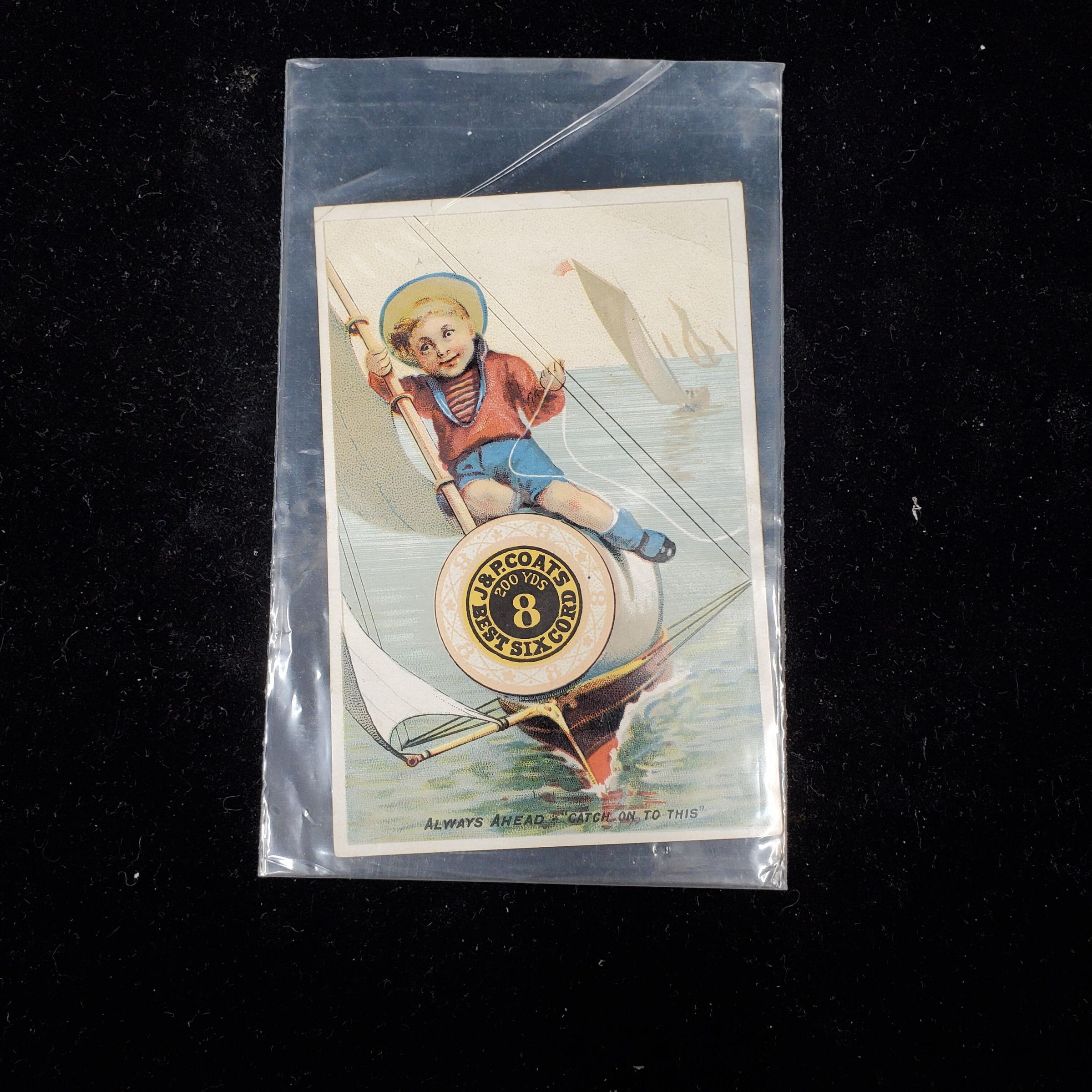 Advertising Trade Card showing a small boy,dressed as a sailor i n a sailing boat, sitting on a spool of J&P Coats Best Six Cord spool of thread. Caption below reads ÒAlways Ahead Catch on To ThisÓ Back of card more advertising