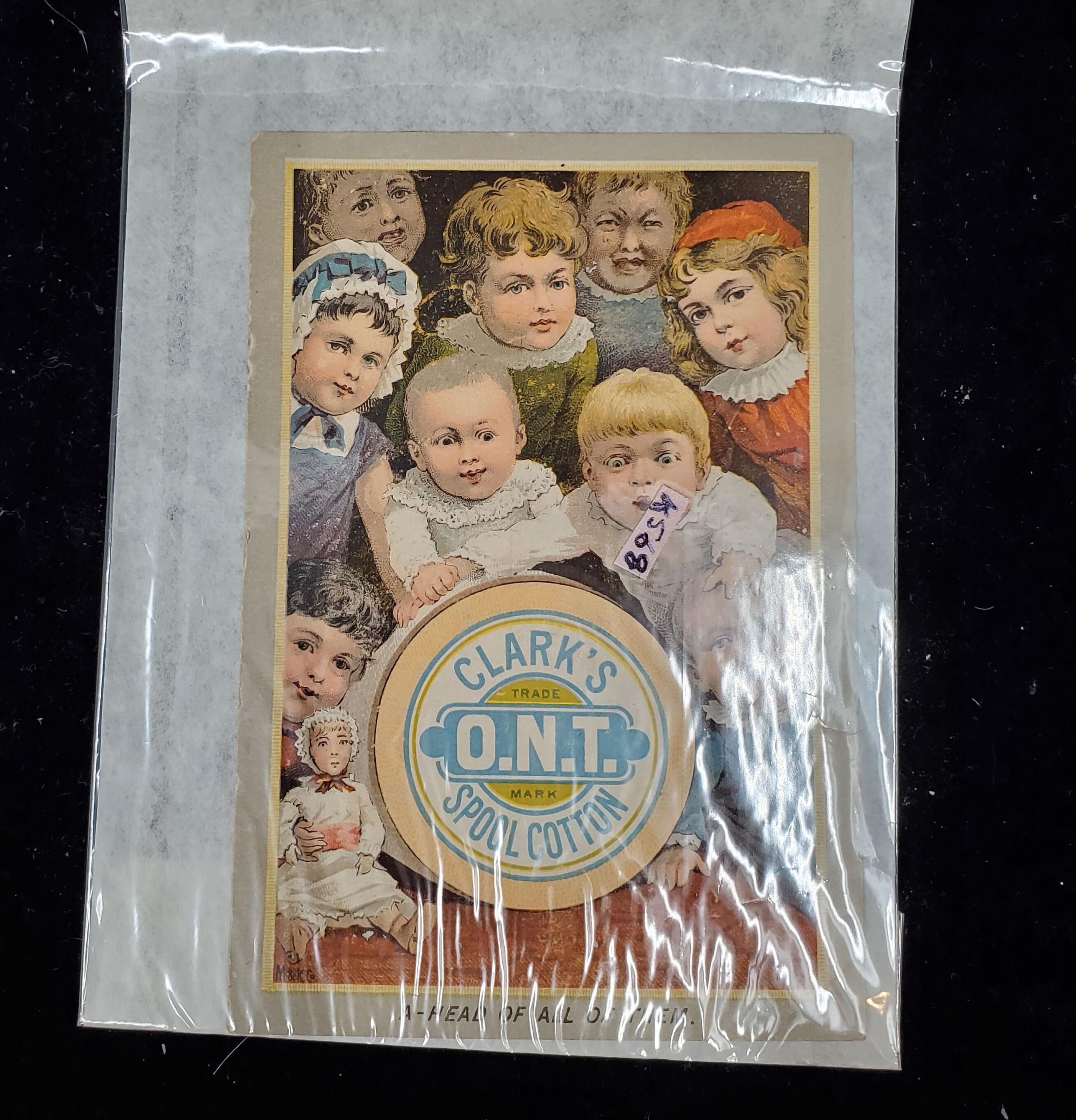 Advertising Trade card. Picture of many baby faces on card with a Clark's O.N.T. Spool Cotton spool of thread in center. Caption reads 'A-Head of All of Them' Back has more advertising.