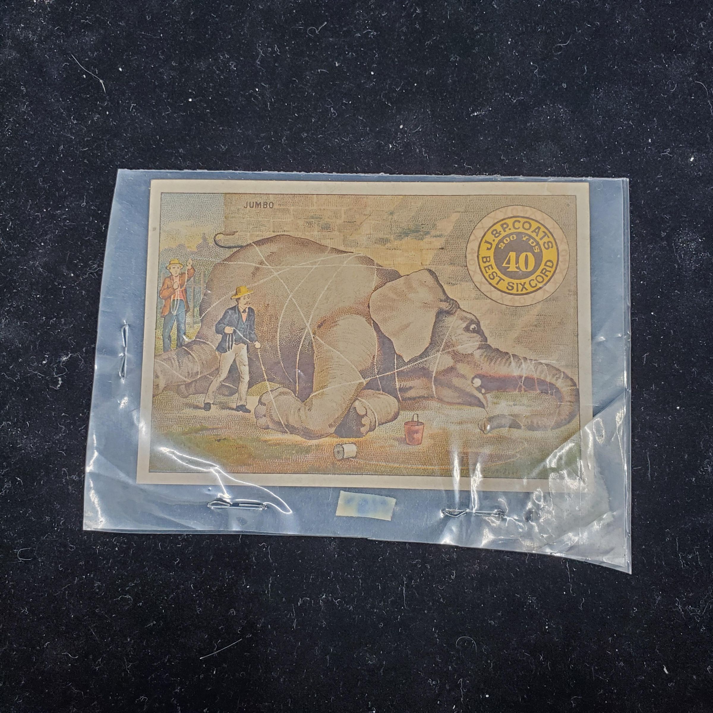 Advertising Trade card. Shows picture of elephant being tied up with white thread. Spool of J.P. Coats Best Six Cord thread shows in upper corner of card. Back has more advertising.