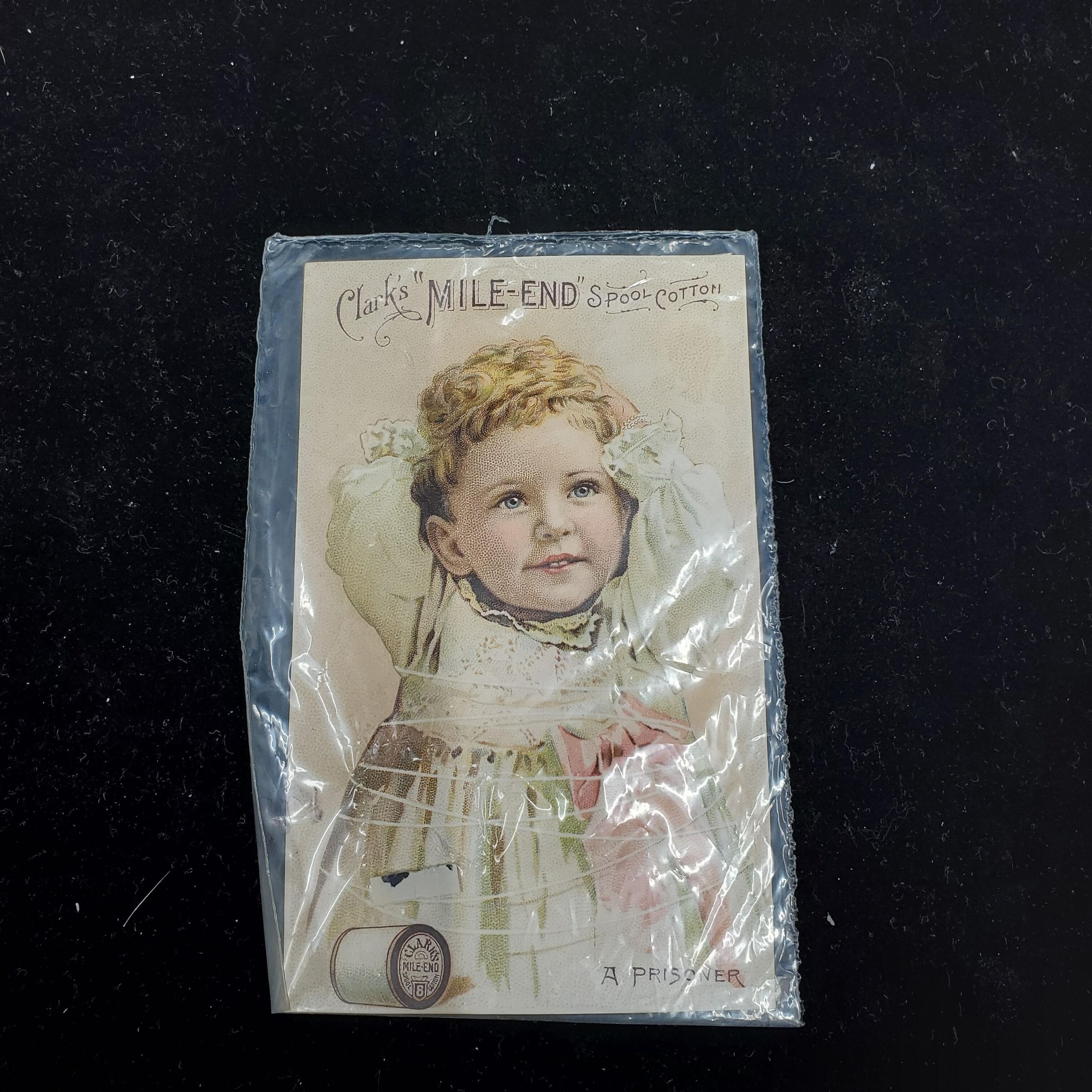 Advertising trade card. Shows picture of young child wrapped around body in thread. Titled ÒA PrisonerÓ Spool of ClarkÕs Mile End Spool Cotton in lower corner of card. Advertising on back.