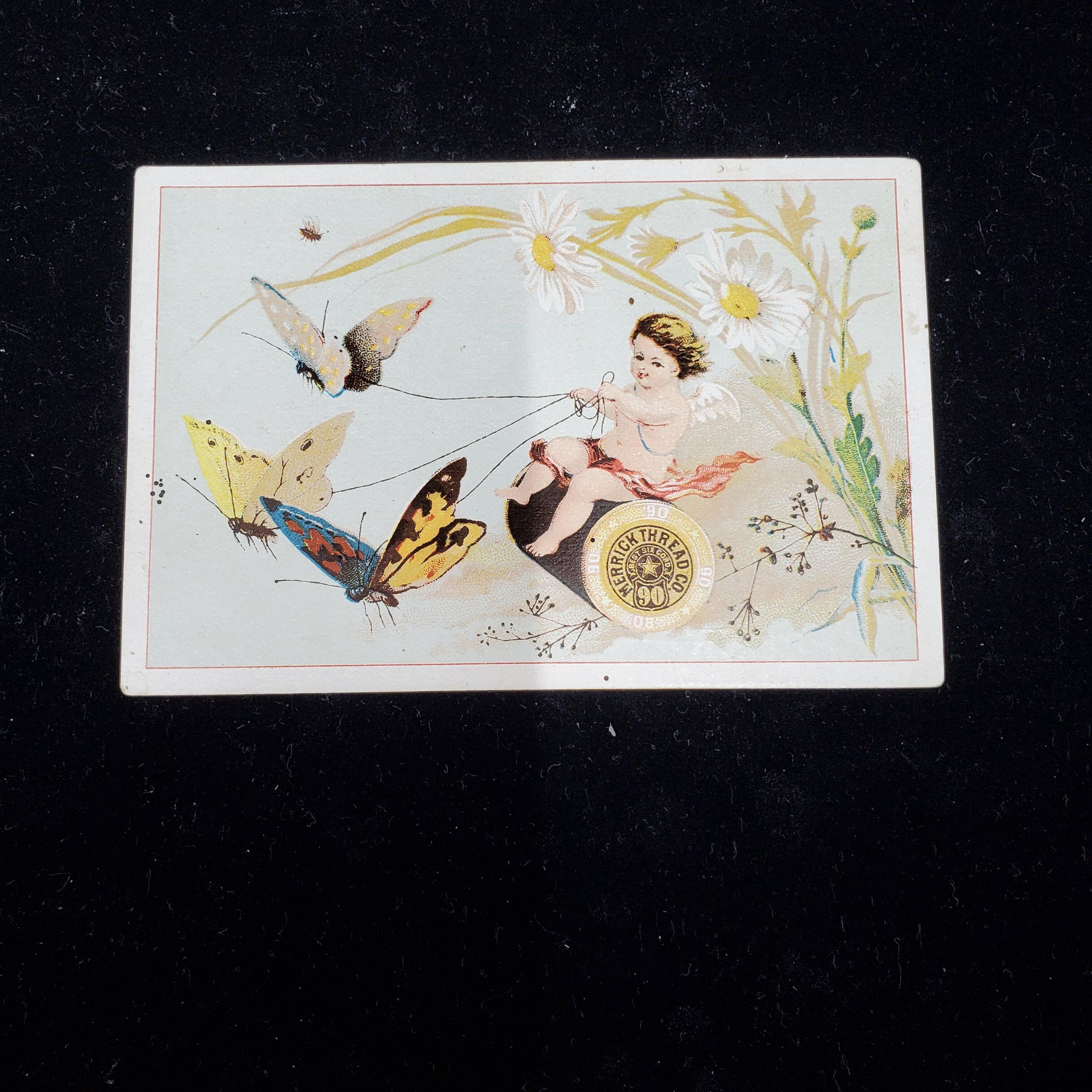 Trade card showing picture of young girl riding on spool of black thread and using thread to drive butterflies ,with flowers around. Spool has ÒMerrick Thread Best Six CordÓ. Advertising on back of card.