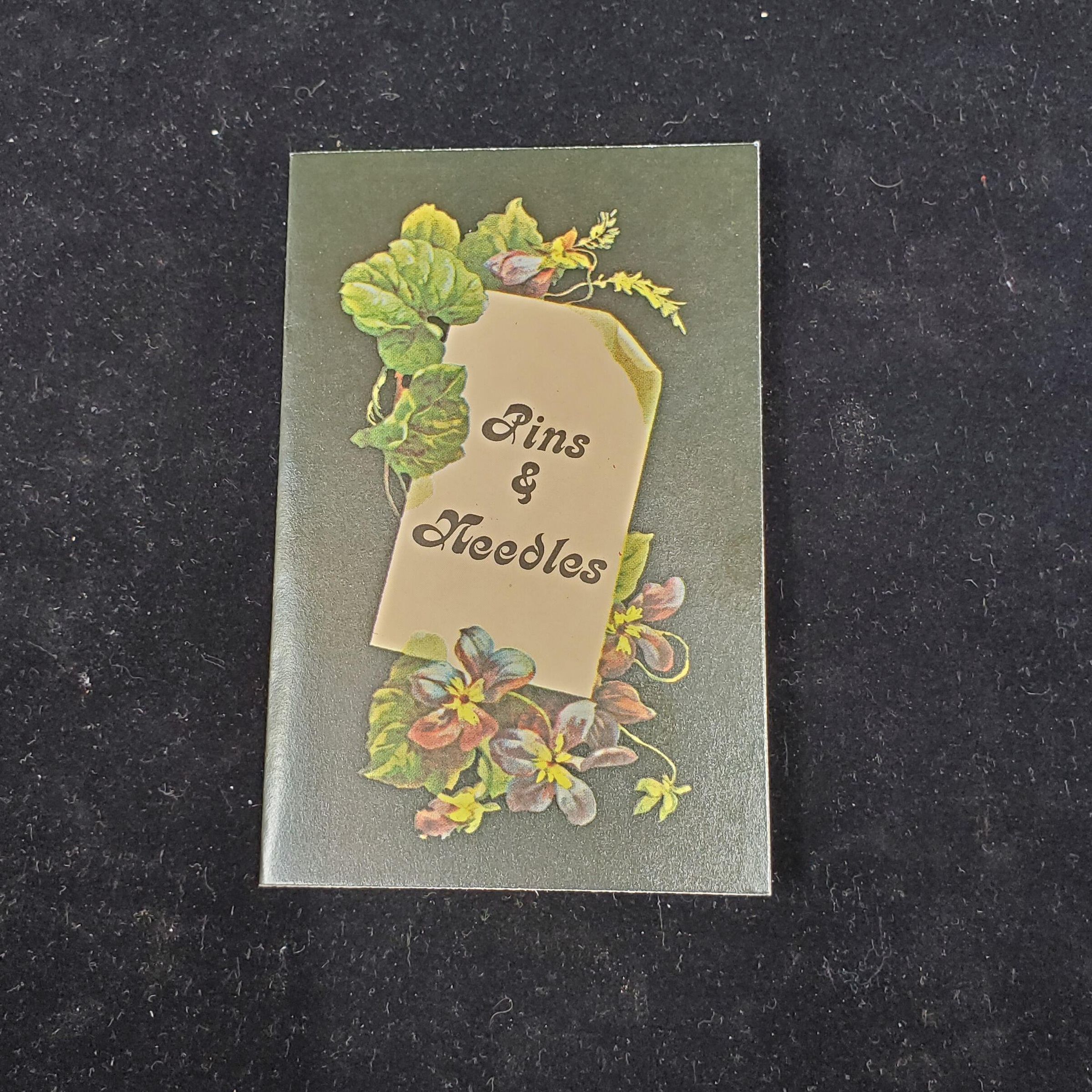 Card folder with flower [icture holding sign which reads ÒPins & Needles.Ó Inside small cloth with needles and pns. Back of card stamped ÒCrawford Giftware Corp. New York Copyright 1981 Made in Hong KongÓ Card inside plain brown envelope.