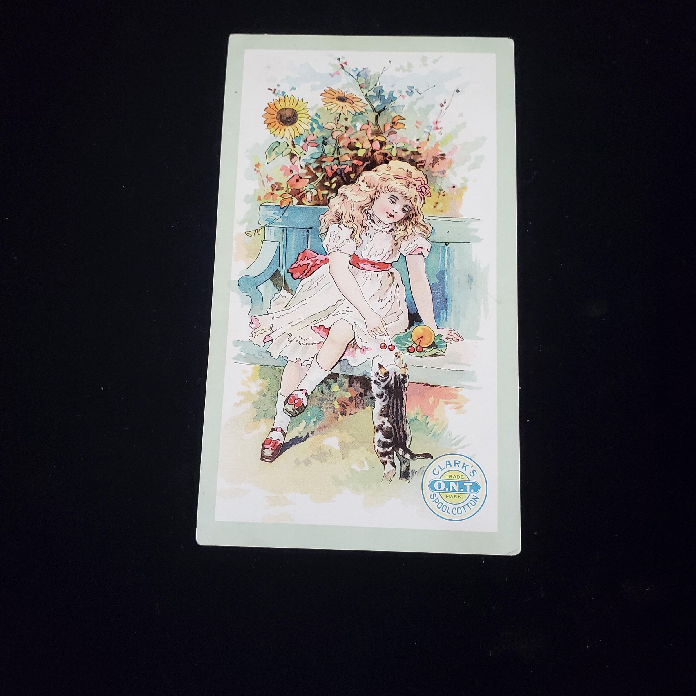 Large Advertising trade card. Picture of girl sitting on bench below colourful flowers. She is feeding cherries to a cat. Spool of ClarkÕ;s O.N.T. Spool Cotton in corner. Back covered with advertising.