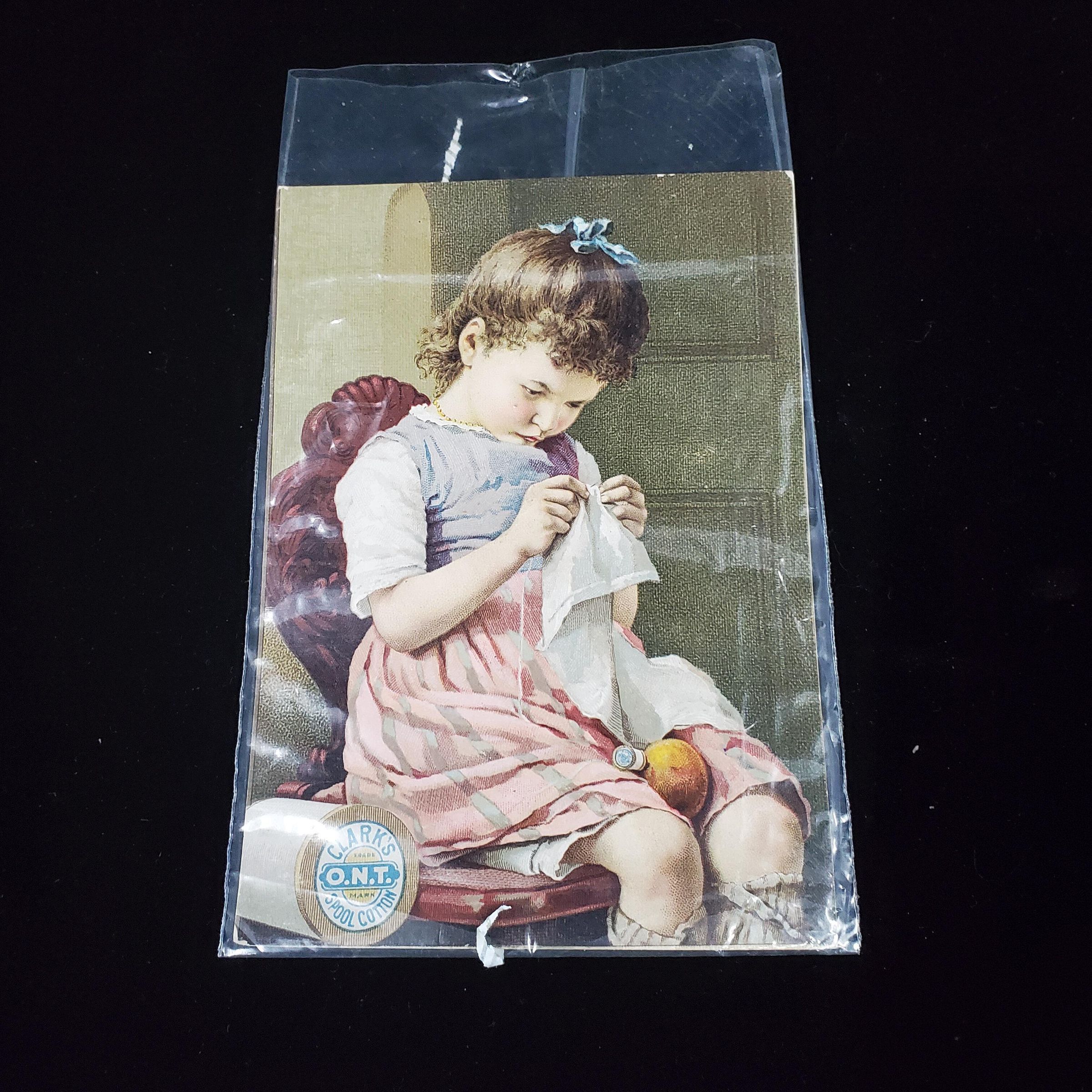 Advertising trade card with picture of young girl sitting on chair , sewing. Spool of ClarkÕs O.N.T. Spool Cotton in corner and one on her lap. Back has more advertising.