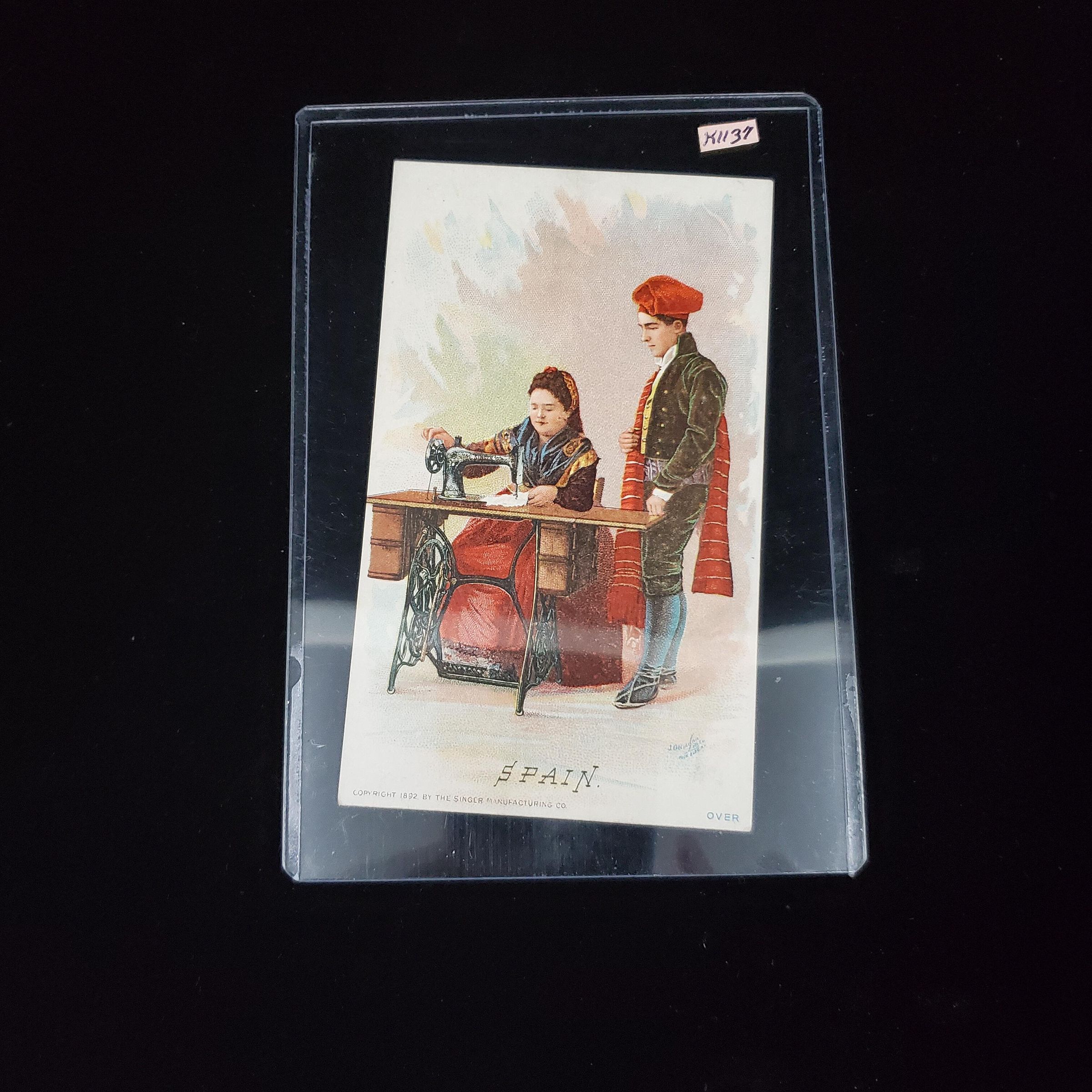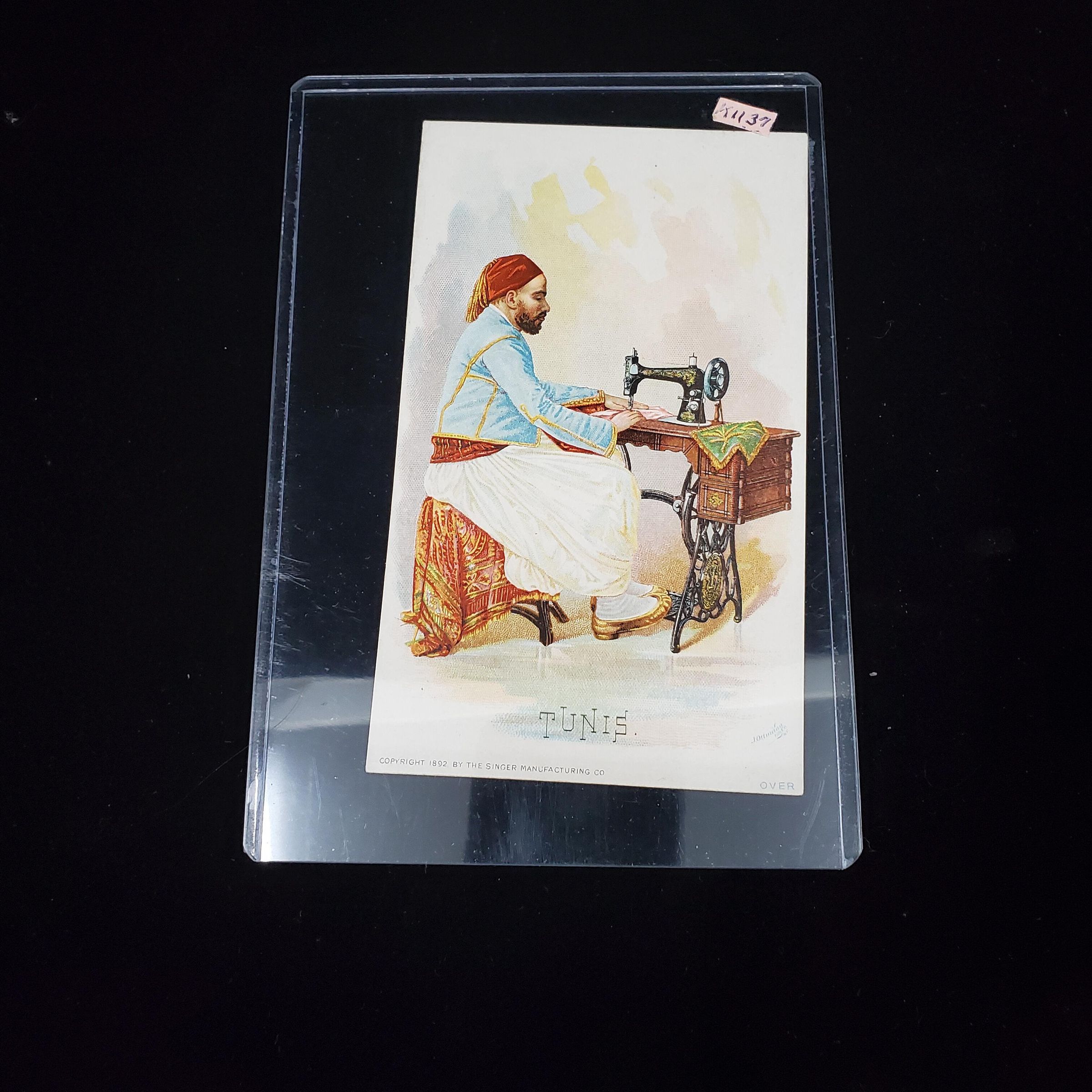 2 trade cards for The Singer Manufacturing Co. 1) Man & woman at sewing machine. Couple in native dress - Spain written below and on back story of people of Barcelona.2) Man in native costume at sewing machine with Tunis written below. On back story of the people of Tunis.