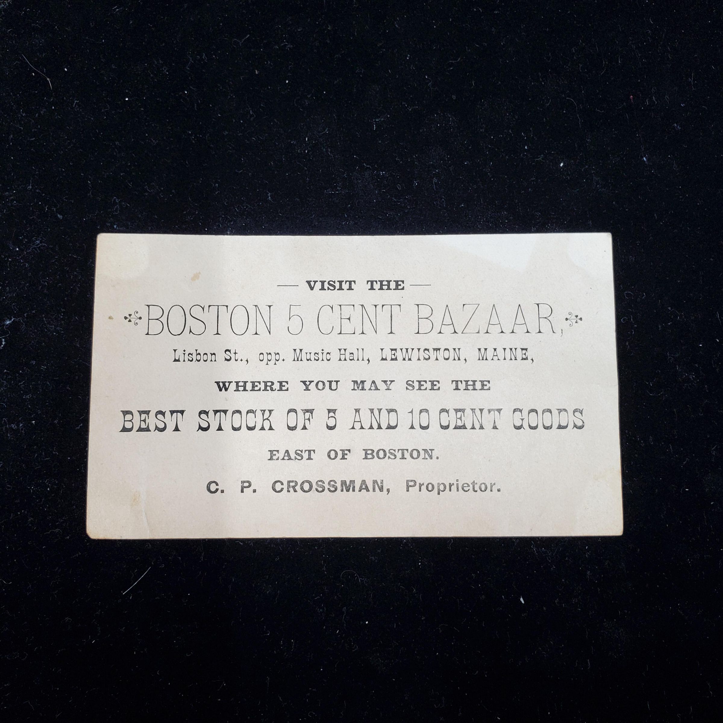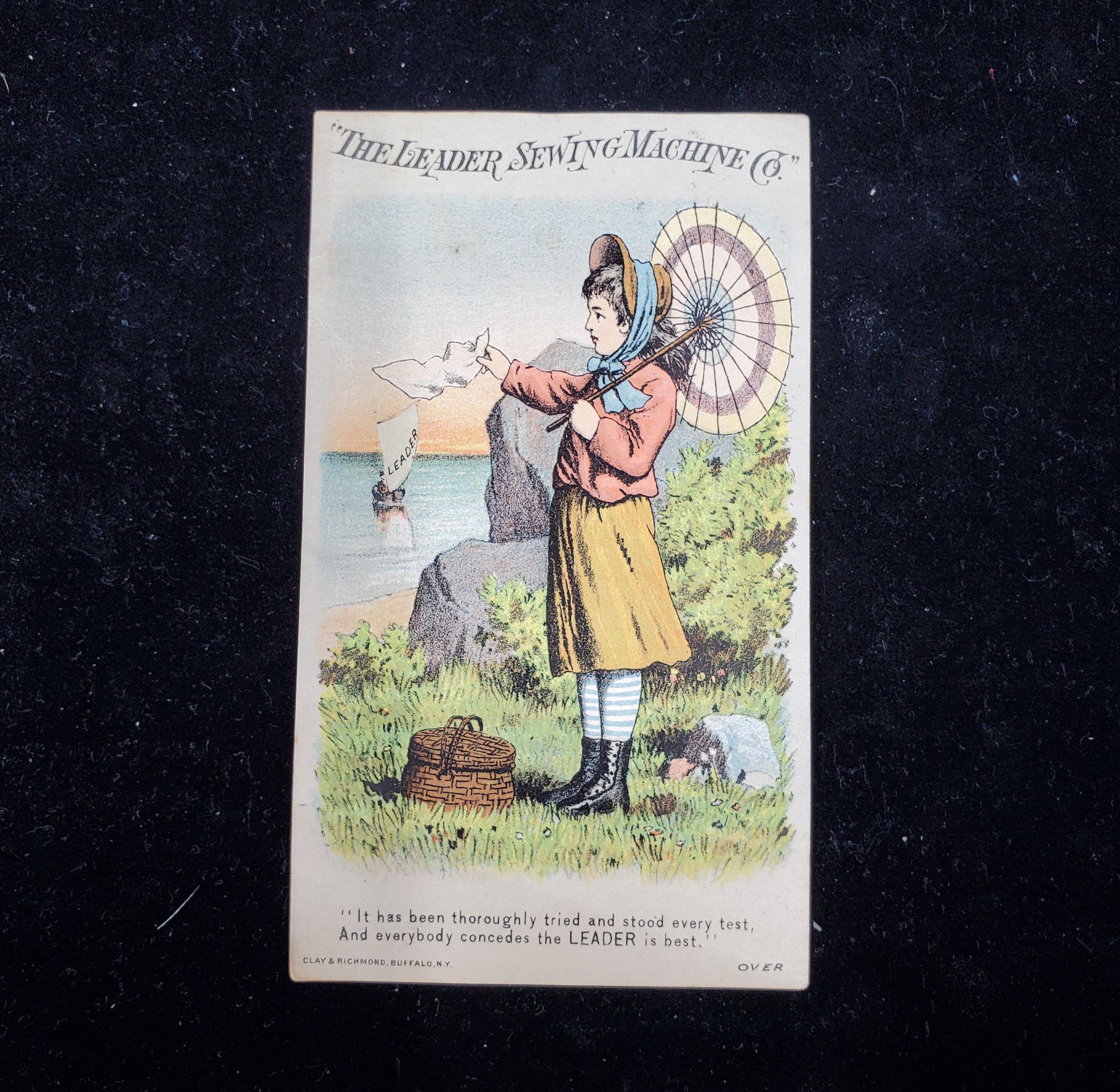 Advertising Trade Card. Picture of young lady,boots, hat, umbrella by water, rocks, waving. Caption reads ÒIt has been thoroughly tried and stood every test And everybody concedes the LEADER is bestÓ Also ÒThe Leader Sewing Machine Co.Ó Back has more advertising with dealers nameÓC.P.Crossman, P{roprietorÓ